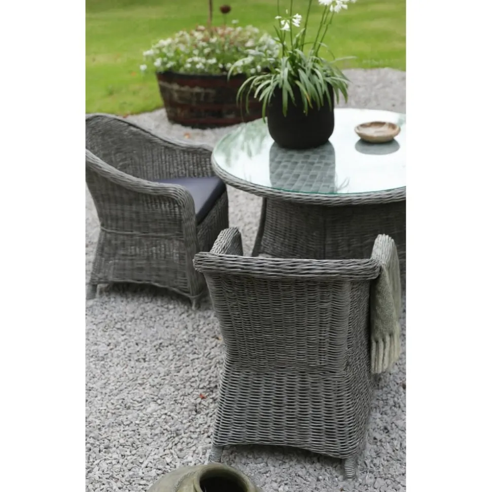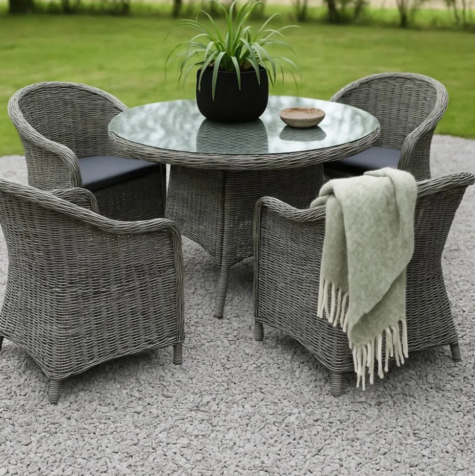 Jacksonville utematgrupp; 110 cm runt bord inkl 4 st Mercury fåtöljer grå konstrotting