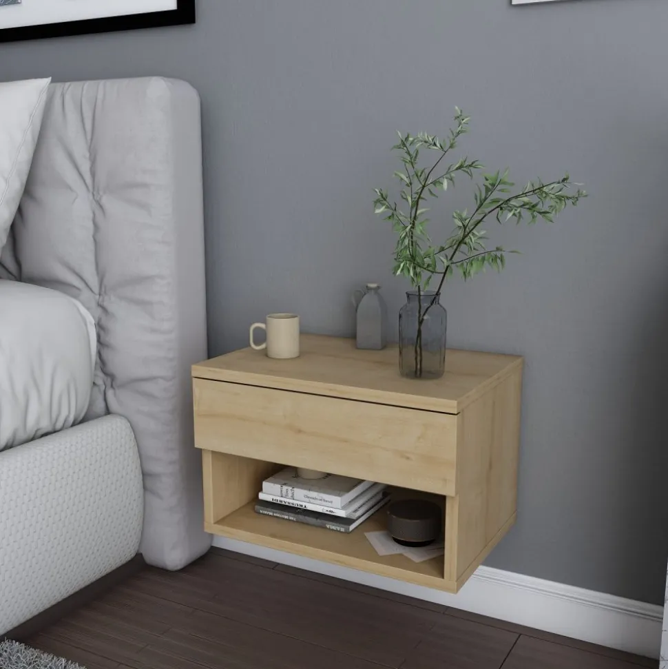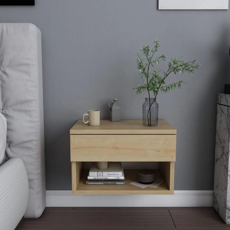 Sängbord av melaminbelagd spånskiva.