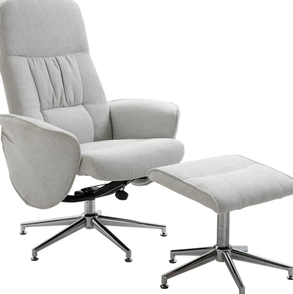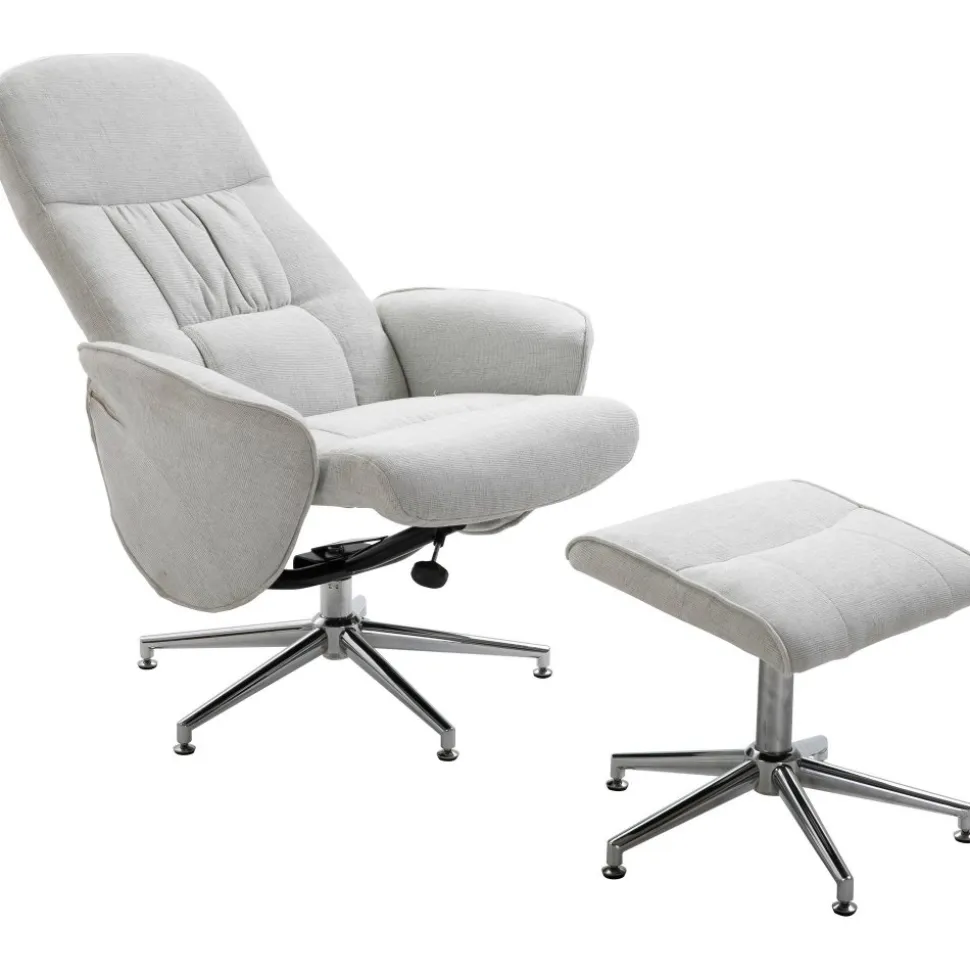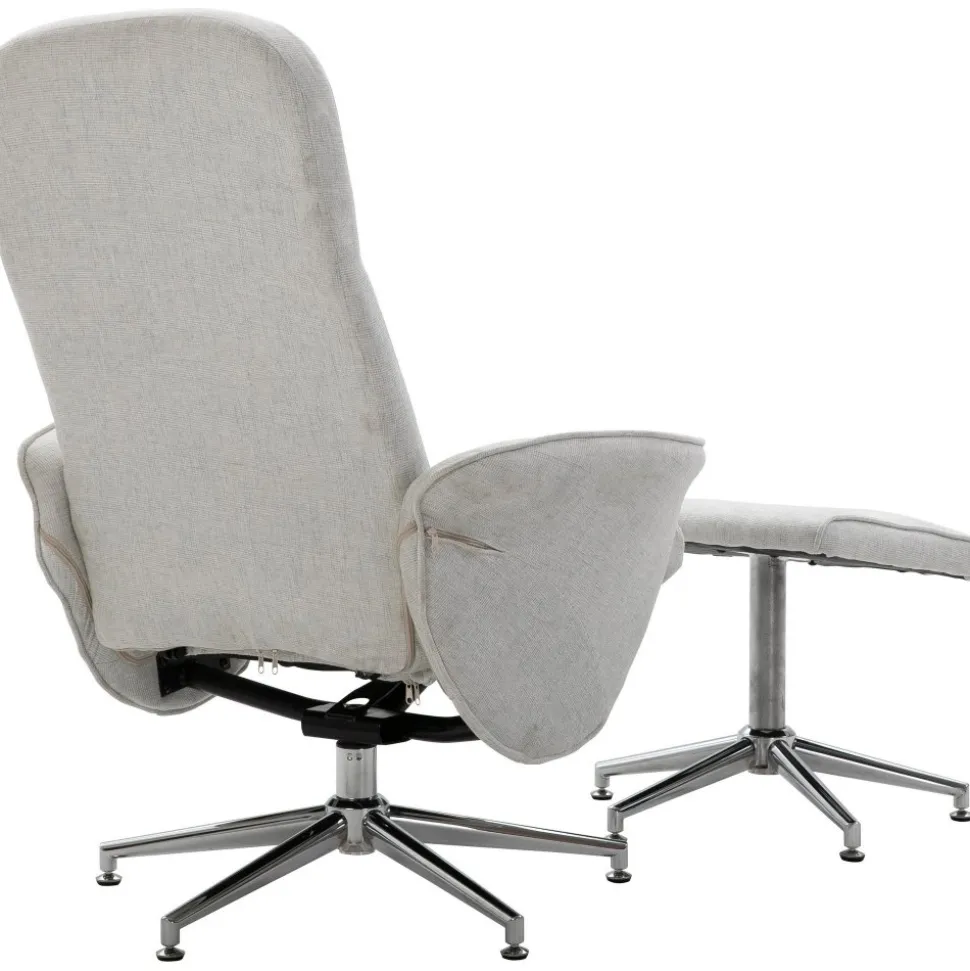 Reclinerfåtölj och fotpall av metall, klädd med polyestertyg.