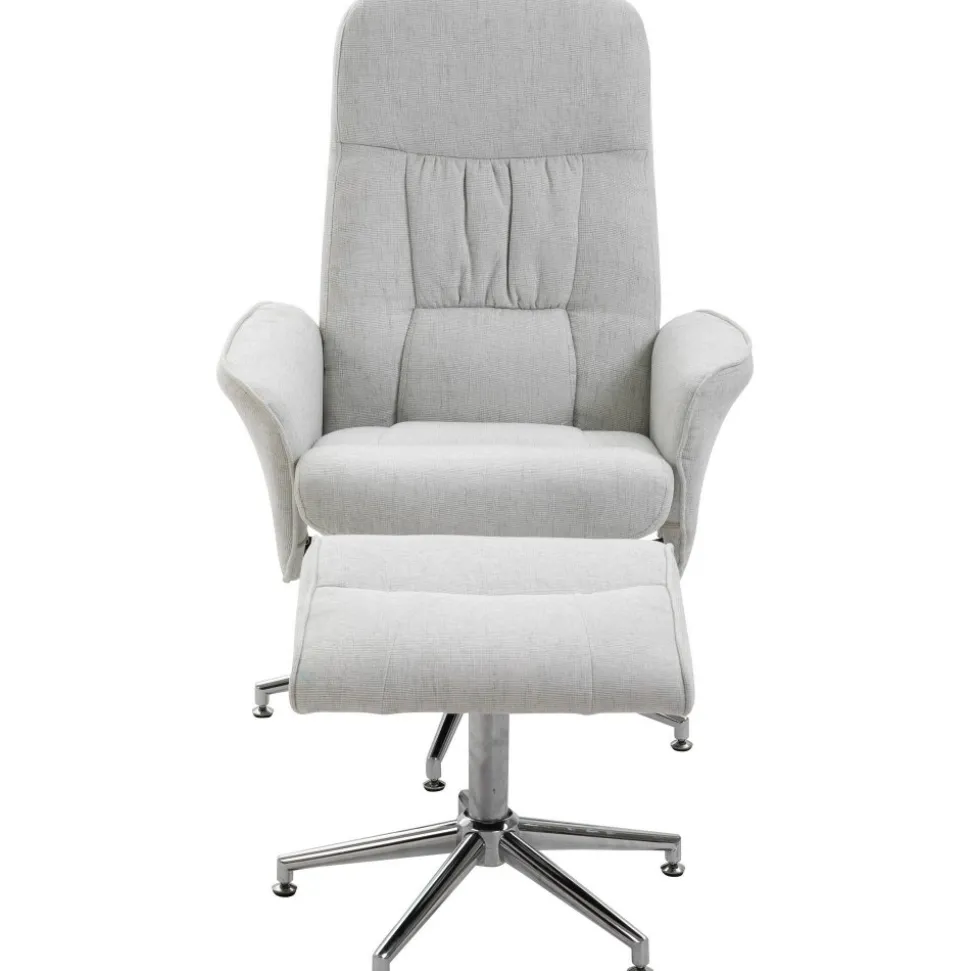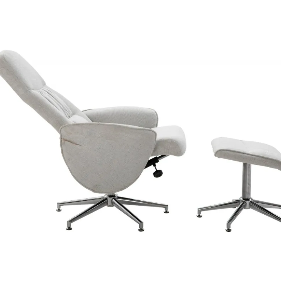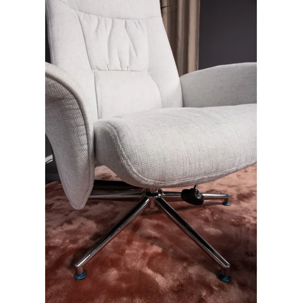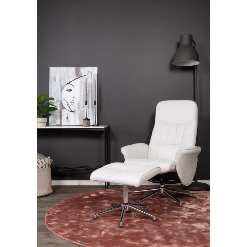 Reclinerfåtölj och fotpall av metall, klädd med polyestertyg.