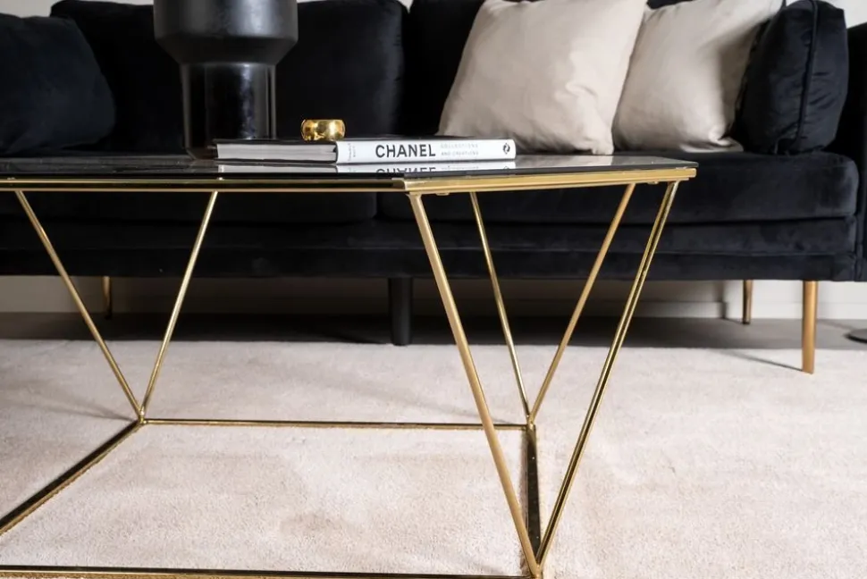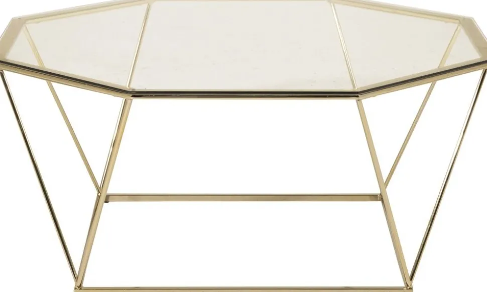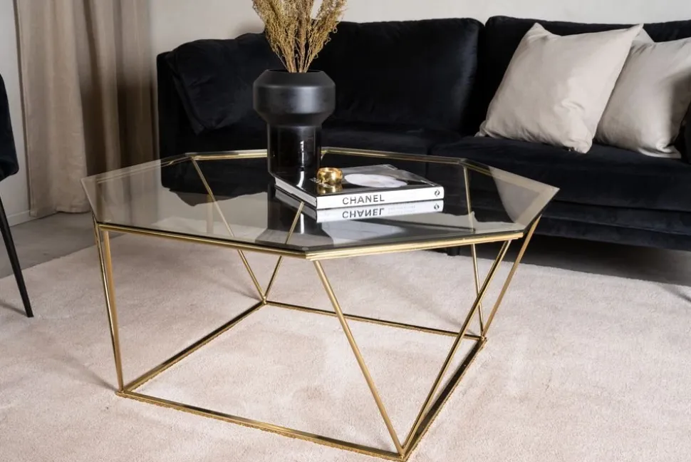 Mångsidigt med toppskiva av glas och tunn ram av mässingsfärgad metall.