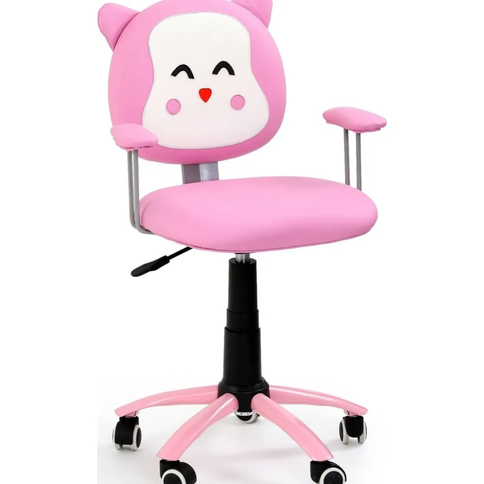 En mysig skrivbordsstol som passar perfekt till barnens rum. Klädd med ett mycket behagligt rosa konstläder med fint tryck på ryggstödet. Höj- och sänkbar sits med hjälp av spaken under sitsen samt lätt att förflytta tack vare hjulen på stjärnfoten.