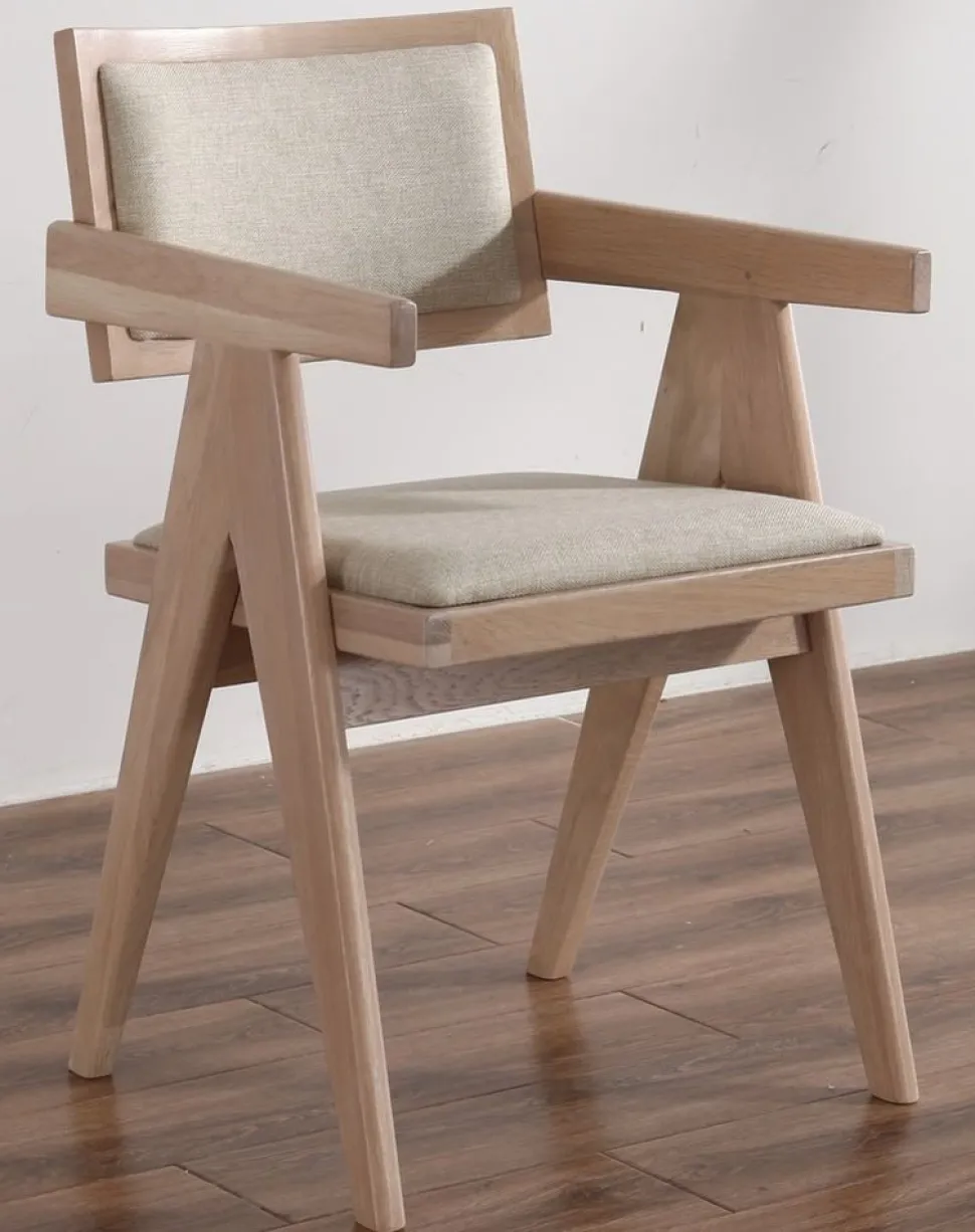 Karmstolen Sara är tillverkad i vitoljad, slitstark ek och har en sits och rygg klädda i grått linnetyg. Den kombinerar modern design med kvalitativa material för en bekväm och ombonad känsla.