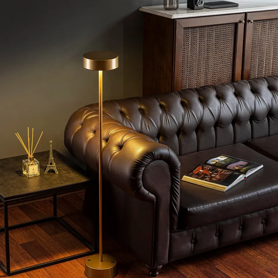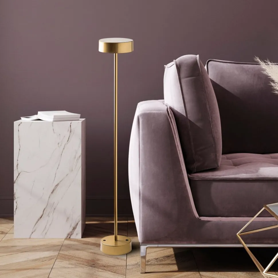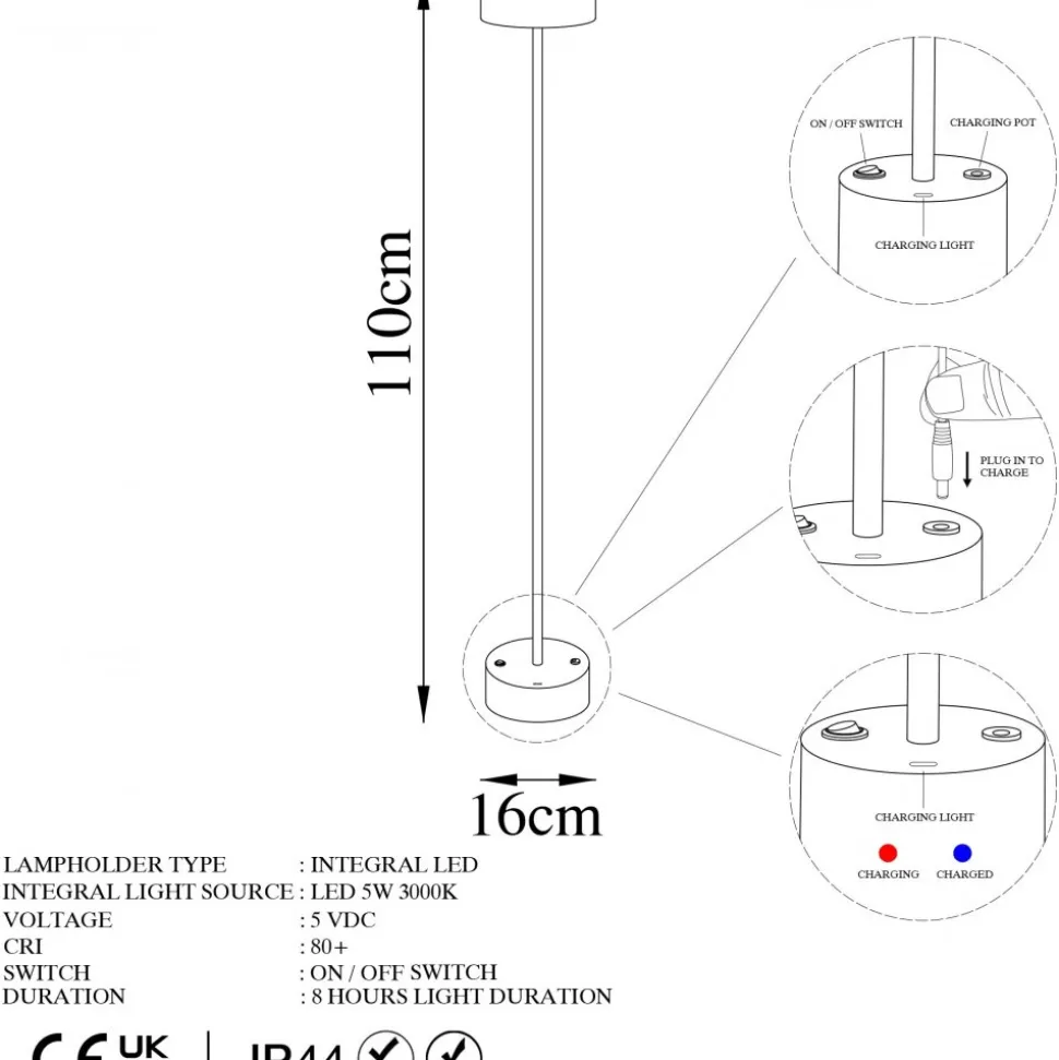 Golvlampa av metall. Kan användas som vanlig nätansluten lampa men kan även användas trådlöst. Full laddning (ca 5 h) ger 8 timmars batteridrift. Ljuskällan är integrerad i lampan och kan inte bytas ut.