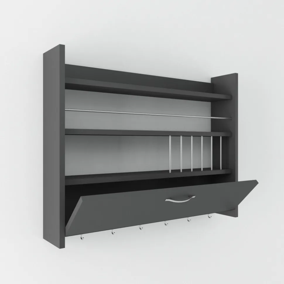 Vägghylla av melaminbelagd spånskiva.