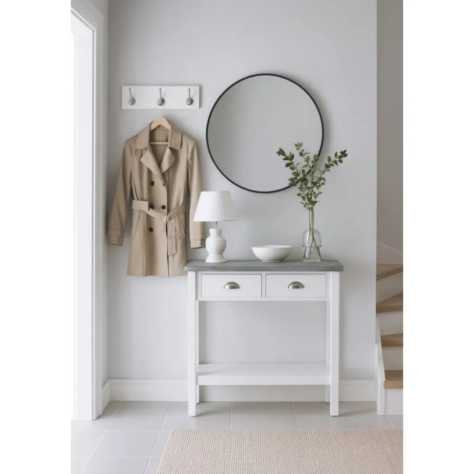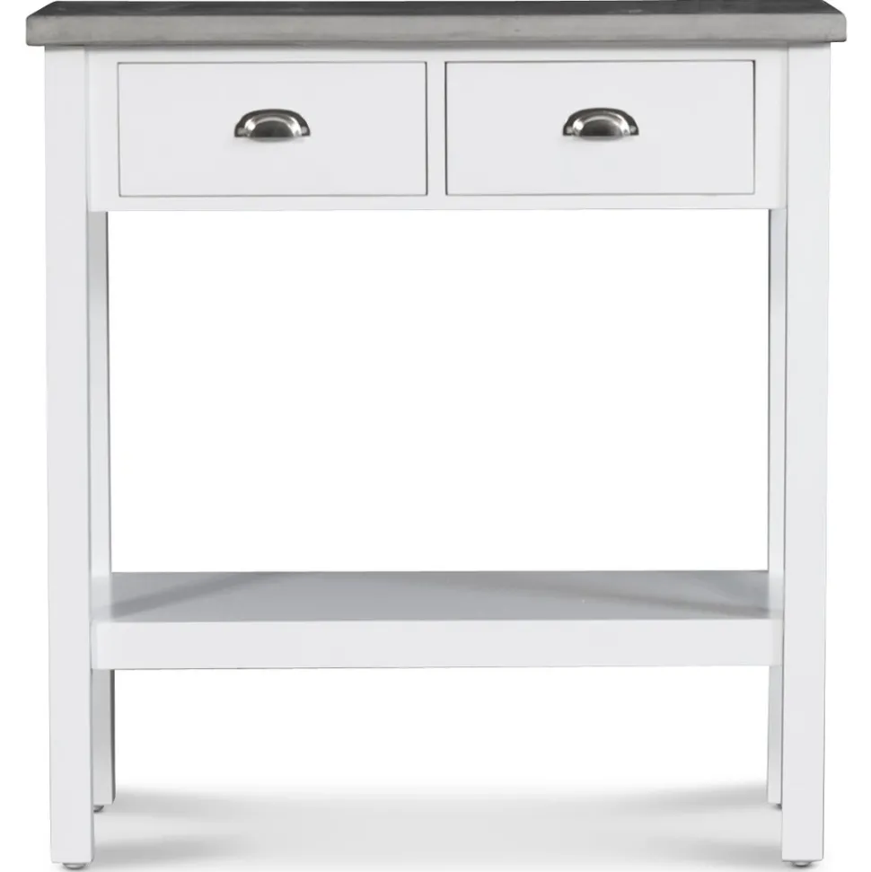 Konsolbord i vitt trä med 2 lådor och en förvaringshylla. Toppskivan har ett ytskickt av microcement för att ge känslan av massiv cement skiva.