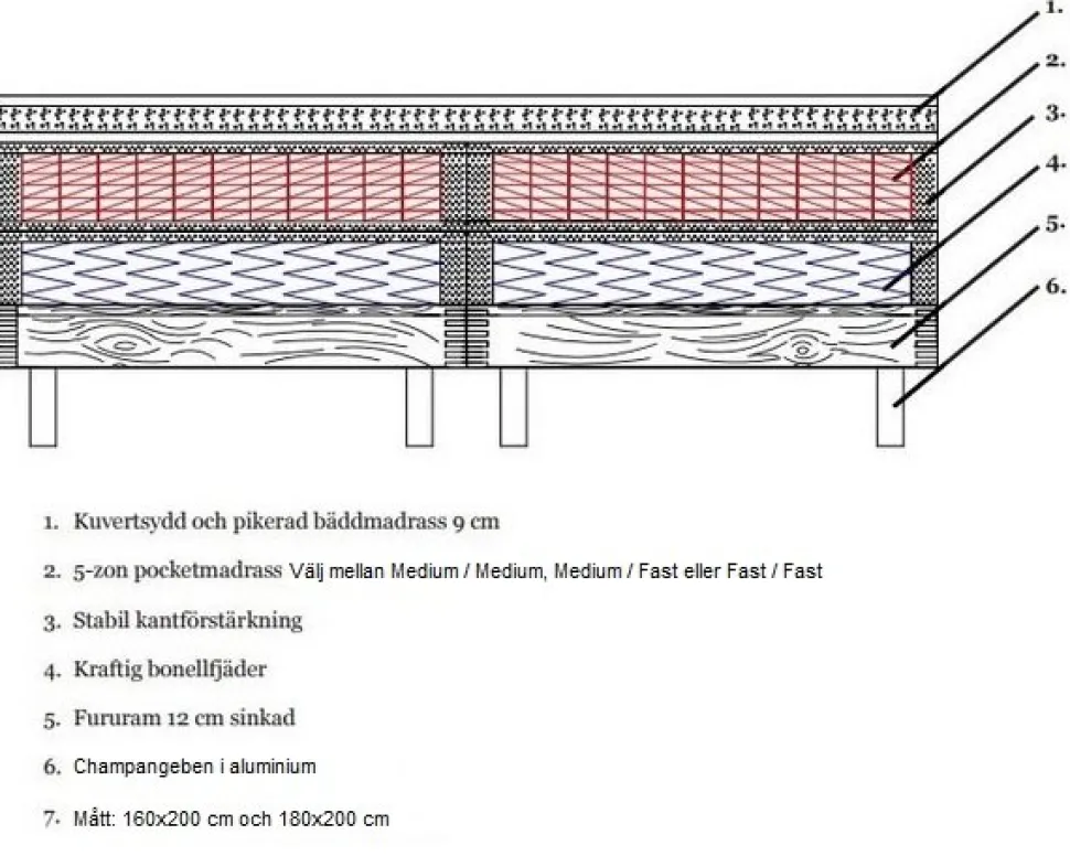 Ovanpå ligger en resårmadrass med 5-zons pocketfjädrar, som ger ett anpassat stöd för kroppens olika delar.