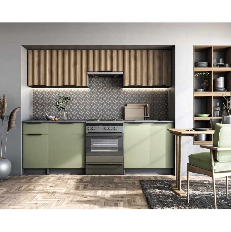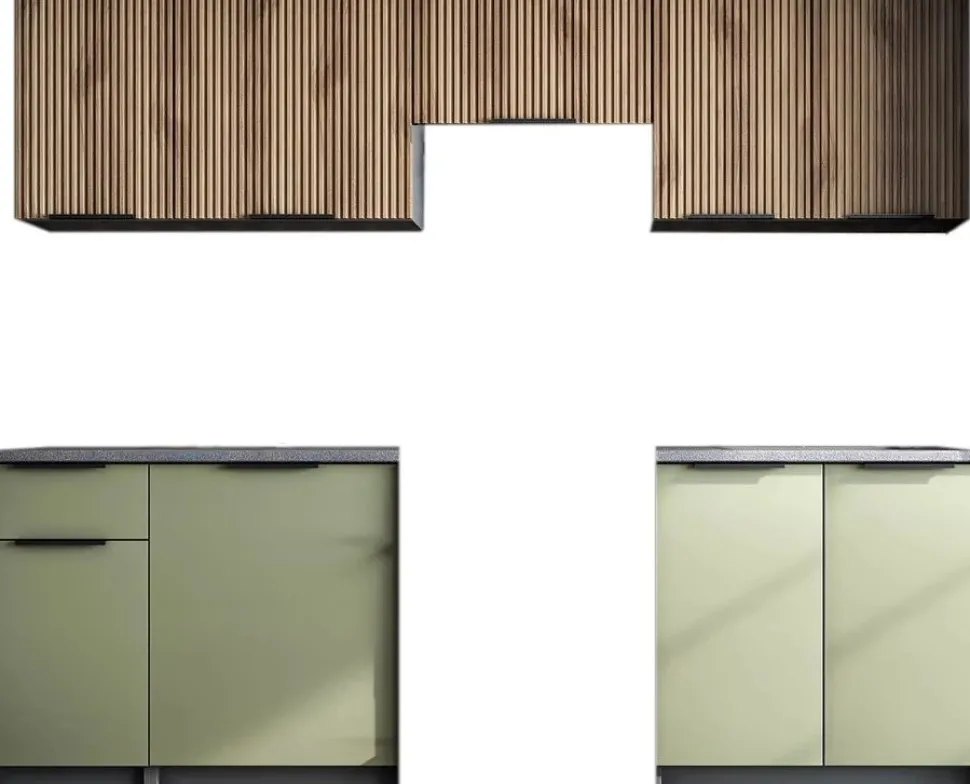 Kombinerar modern design med en unik färgpalett som skapar ett inbjudande och stilrent kök. Med en total längd på 240 cm erbjuder detta gott om arbetsyta och förvaringsutrymme, samtidigt som det ger ett fräscht och modernt intryck. Den kombinerade färgen av ljus valnöt och pistasch tillsammans med en antracitfärgad stomme och grå bänkskiva ger en balanserad och sofistikerad atmosfär.