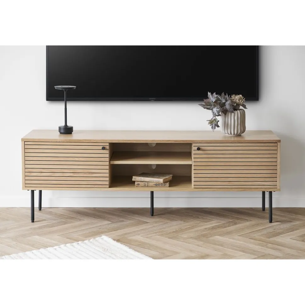 Mediabänk av MDF och ekfanér med ben av stål.