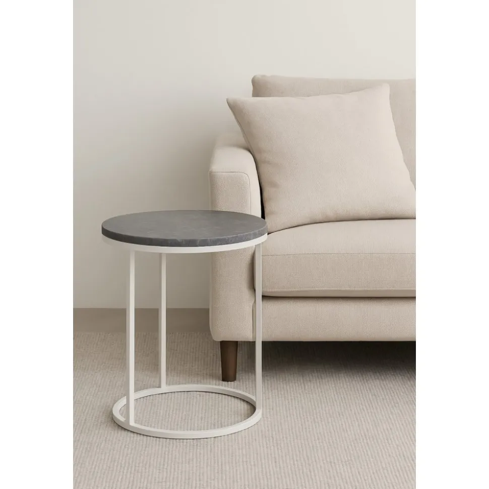 Accent soffbord med en grå äkta marmorskiva och vitlackat metallunderrede. Accent är ett stilrent med vacker design och har en mycket lång hållbarhet. Accent är ett väldigt prisvärt soffbord.