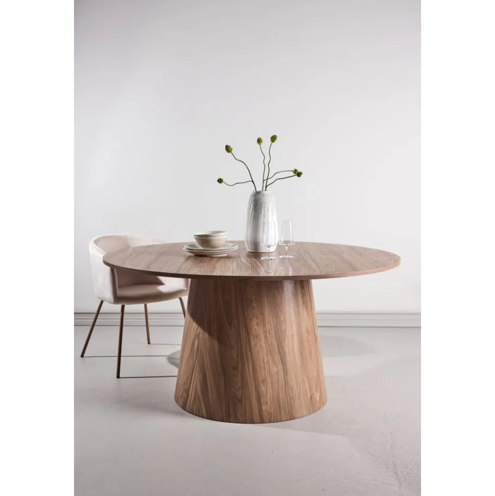 Matbord LANZO imponerar med sin Skandinaviska design och smakfulla utformning. Bordet har en genomgående helhetsdesign i MDF med en tunn, rund toppskiva och en vriden cylinderformad stomme som är centrerad under bordets mitt. Kulören är jordnära och synliggör materialets mönster som ger liv och rörelse till bordet. Skapa ett stilrent blickfång i hemmets hjärta – här hamnar ingen på kanten. Ytan efterliknar valnötsträ.