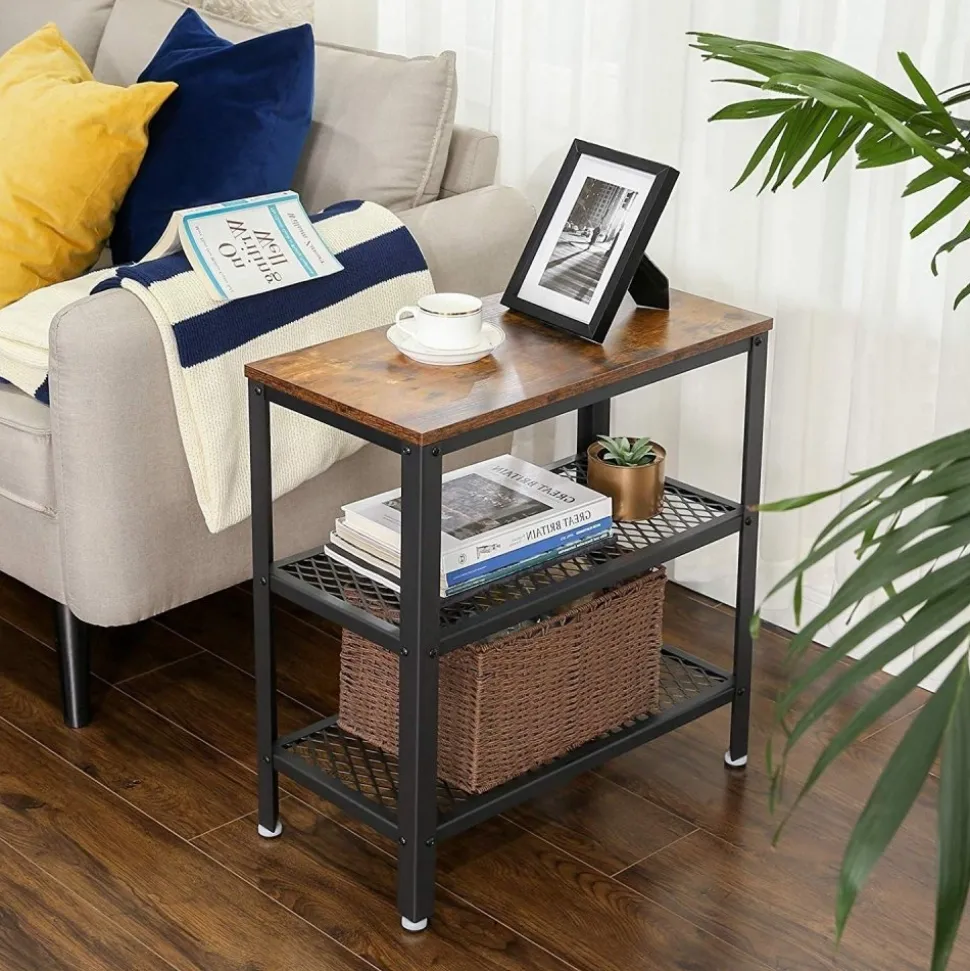 Sidobord av trä och stål.