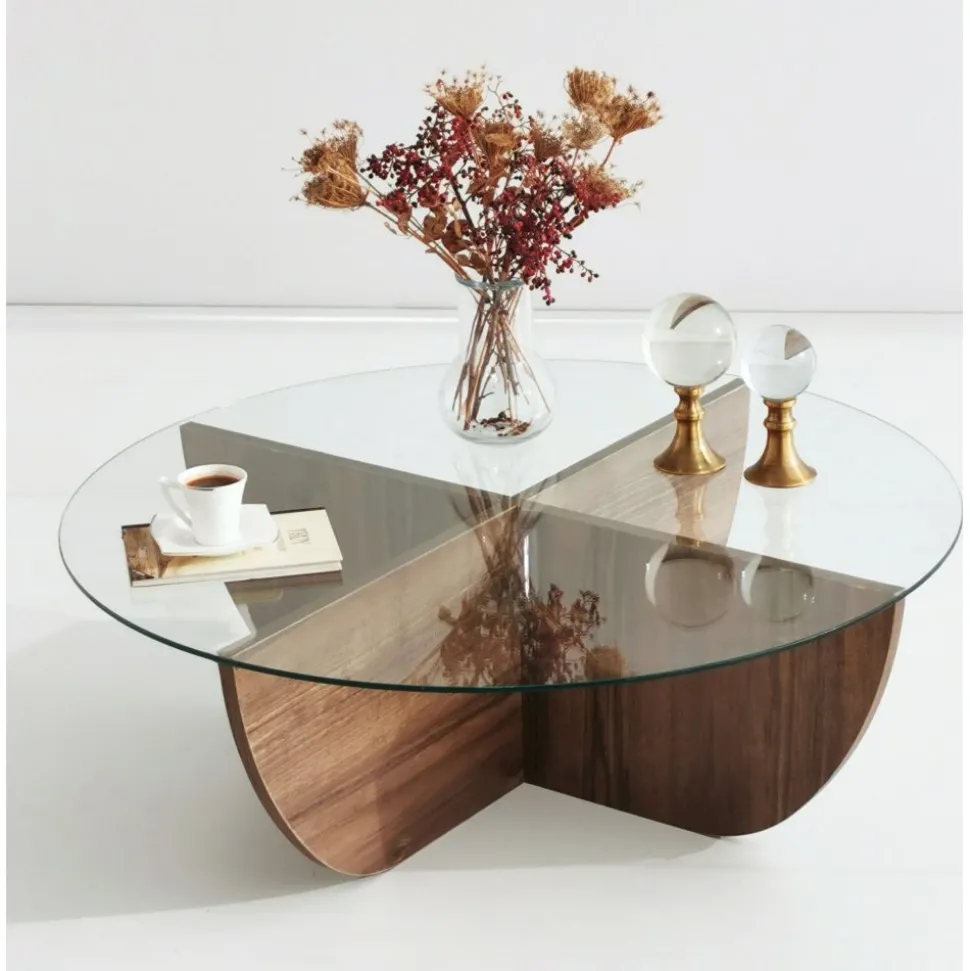 Soffbord av melaminbelagd spånskiva. Bordsskiva av tempererat glas.