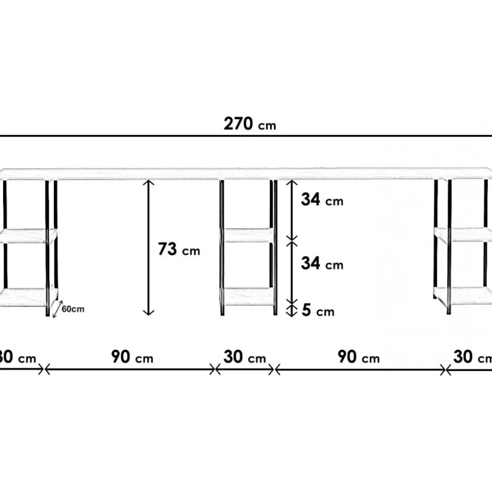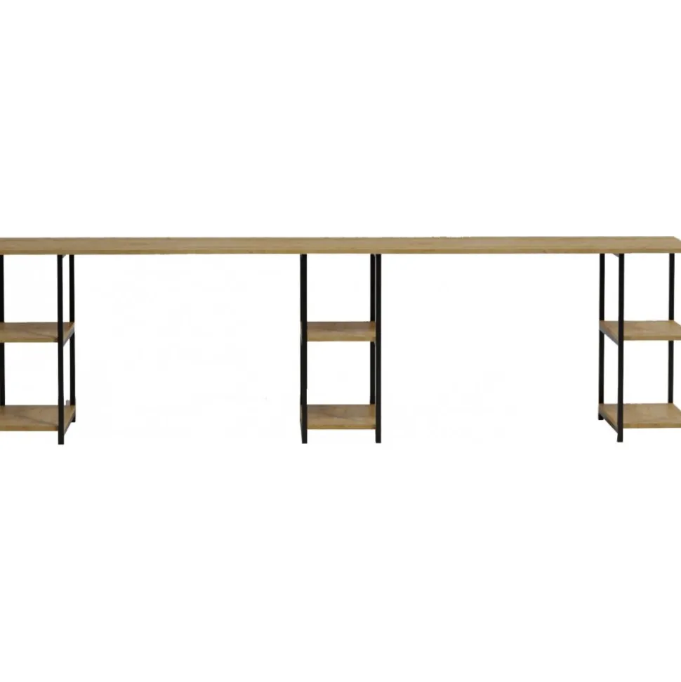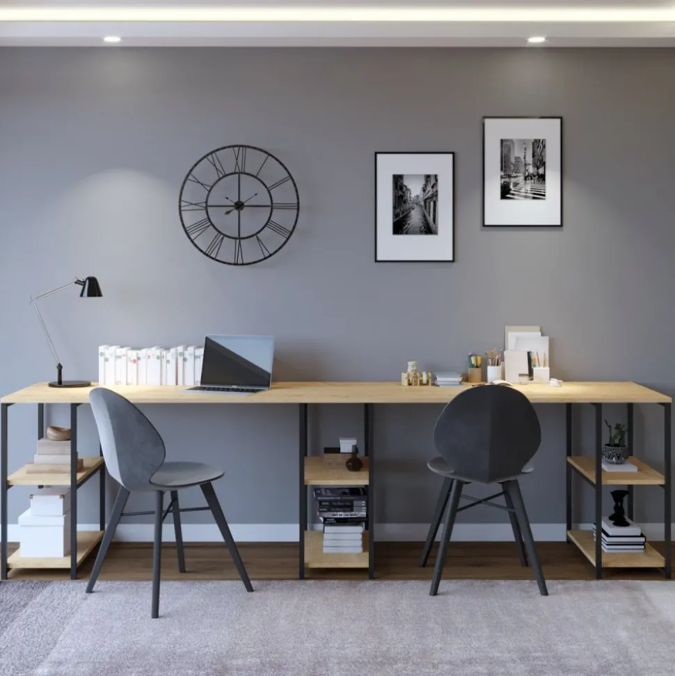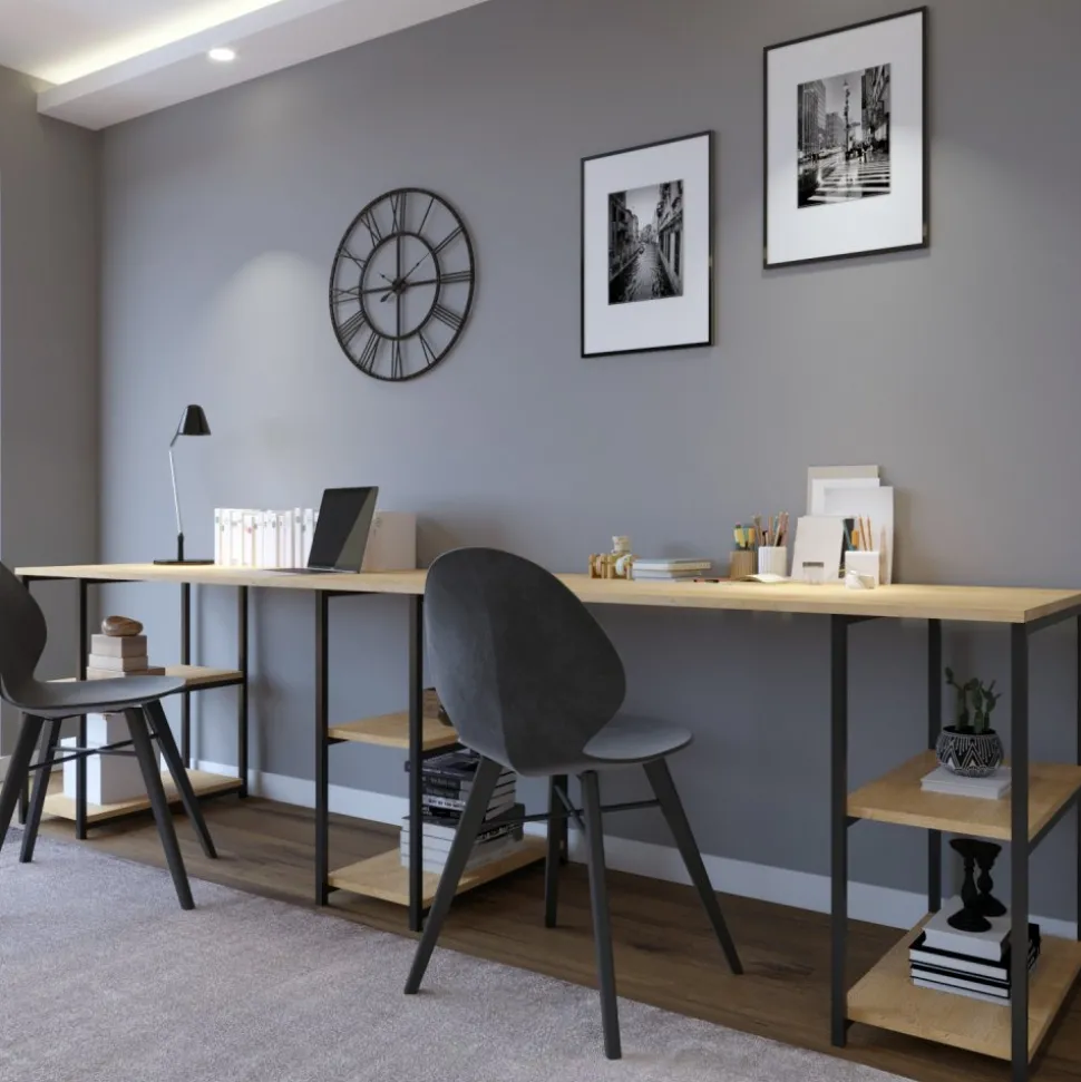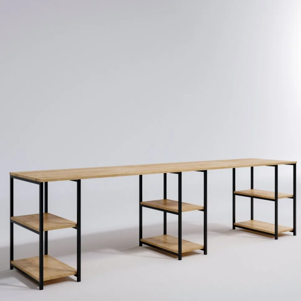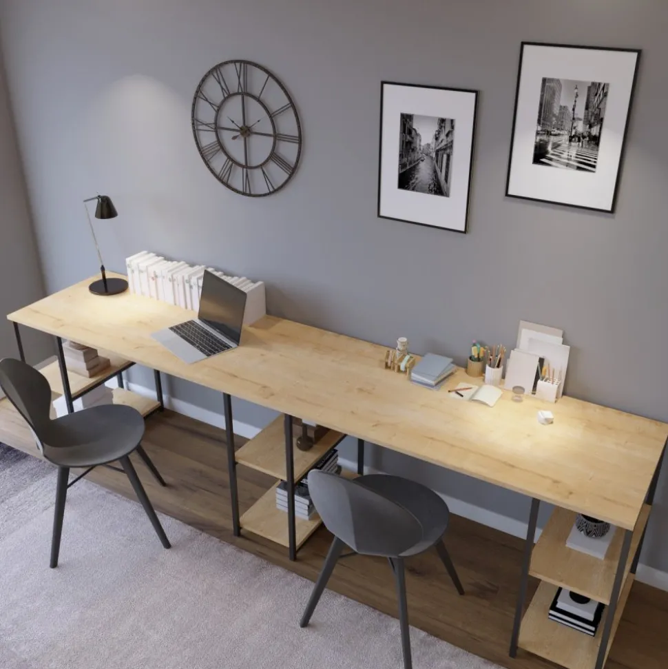 Skrivbord av melaminbelagd spånskiva. Ben av metall.