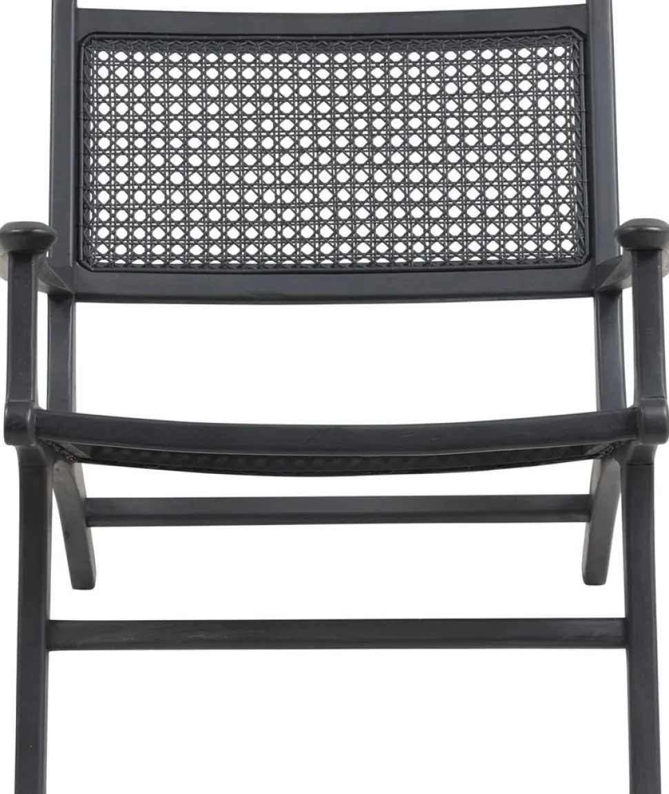 Fåtölj i svart med stomme av teak och sits av svart rotting.