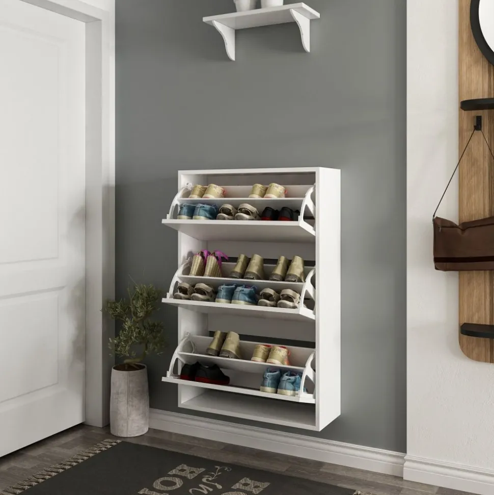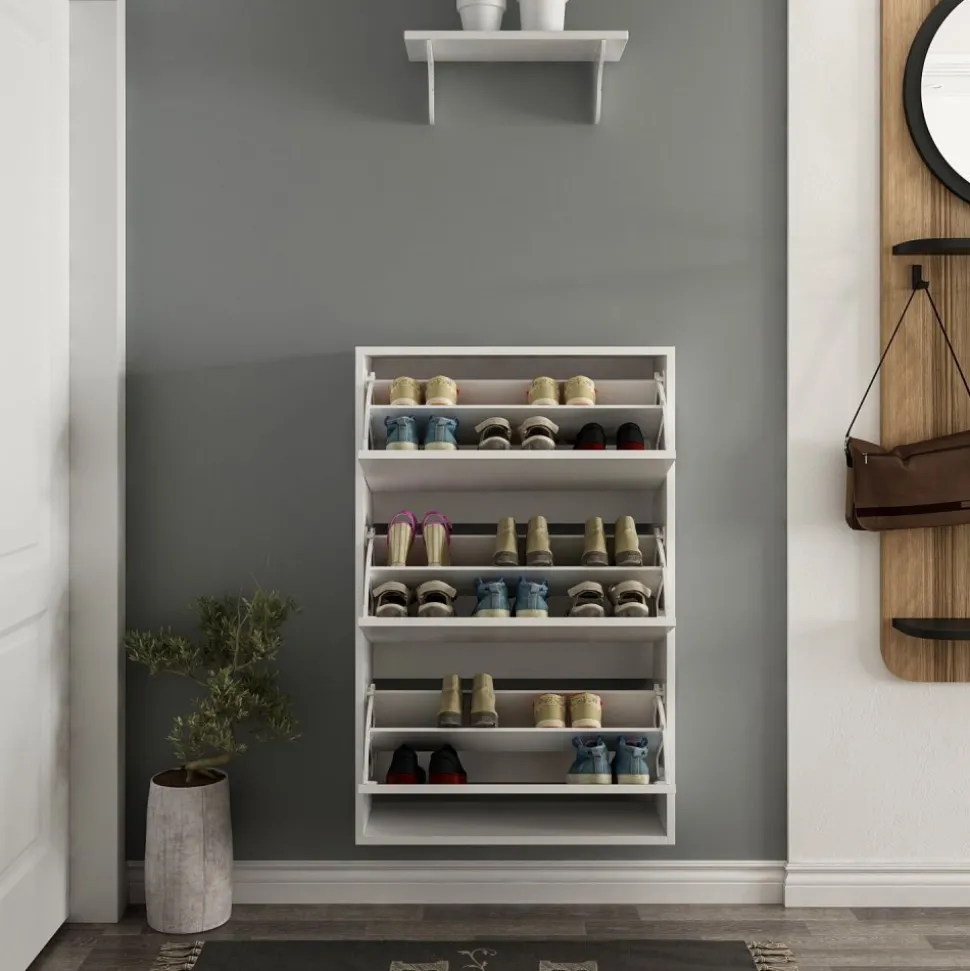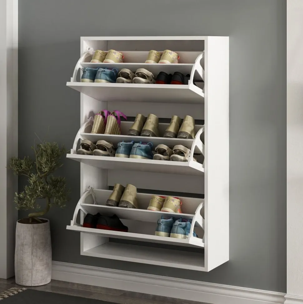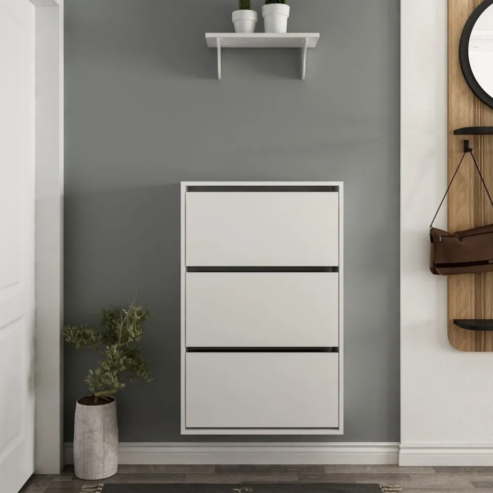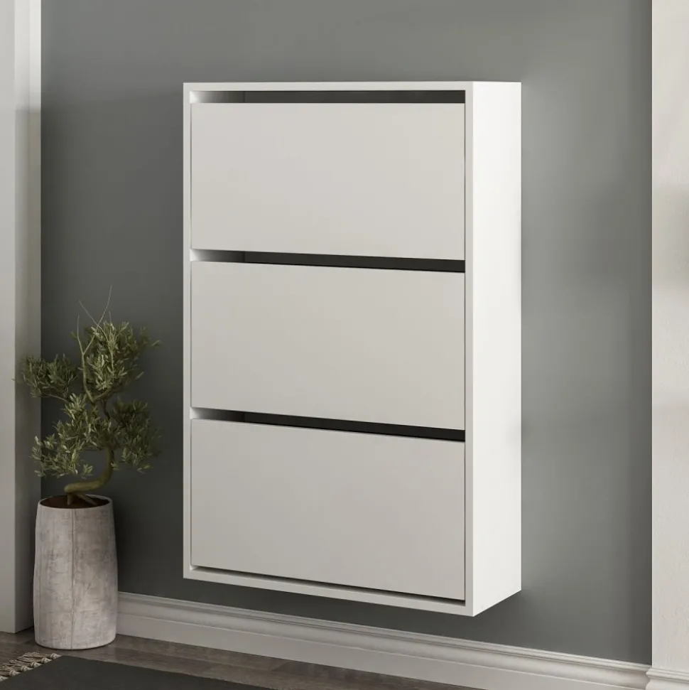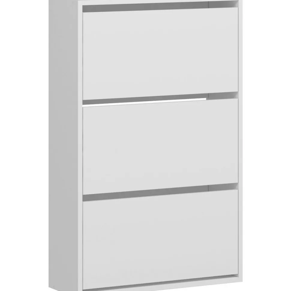 Skoskåp av melaminbelagd spånskiva.