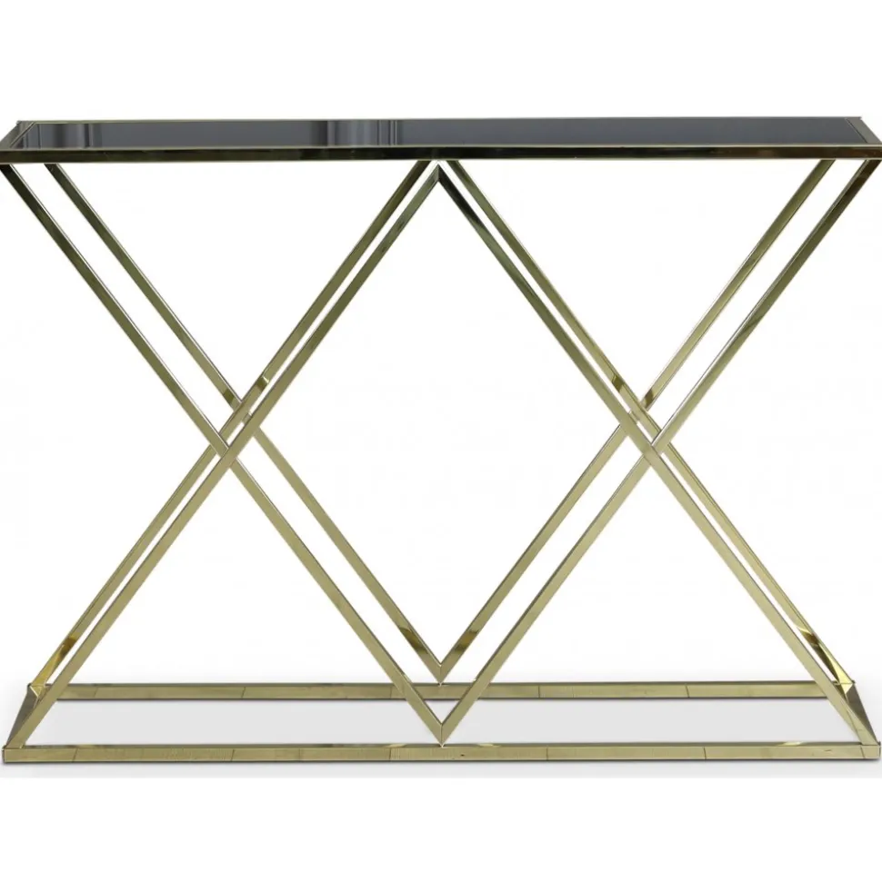 Stilrent i blank mässing med toppskiva i mörktonat glas.