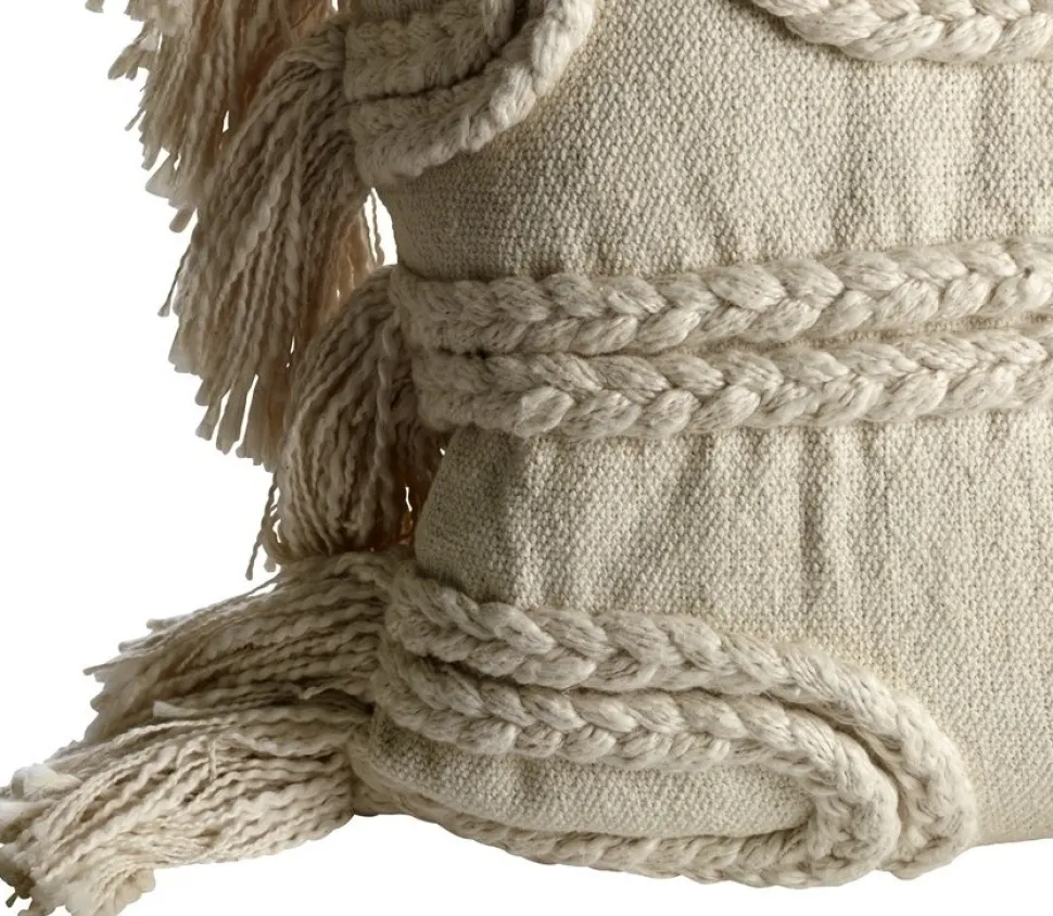 Snyggt med påsydda rep som slutar i tofsar på olika ställen på sidorna. Enfärgad baksida.