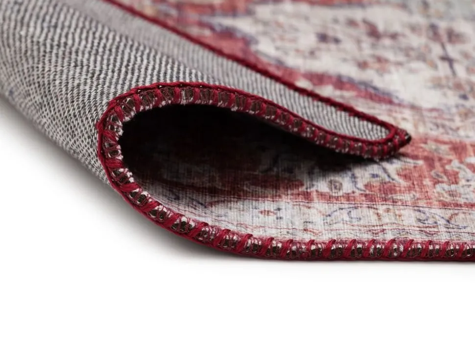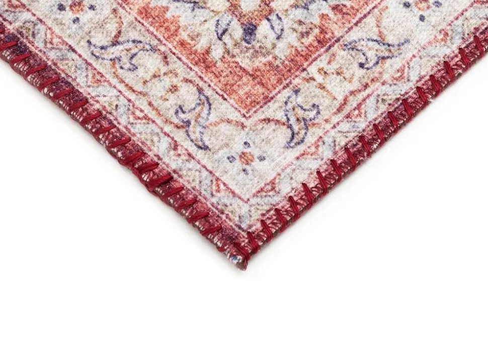 Cleo Colourful är en elegant som har vackert mönster med orientalisk inspiration. Mattan har en melerad roströd bottenfärg med tryckt mönster i röda och blå toner. Mattans kanter pryds utav en sydd langettering som består av riktiga stygn i röd ton, vilket ger en exklusiv och lyxig känsla.