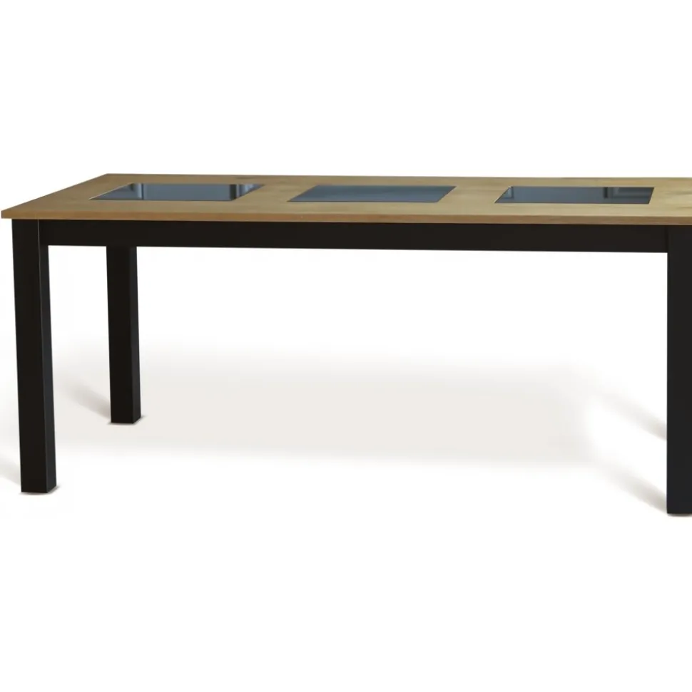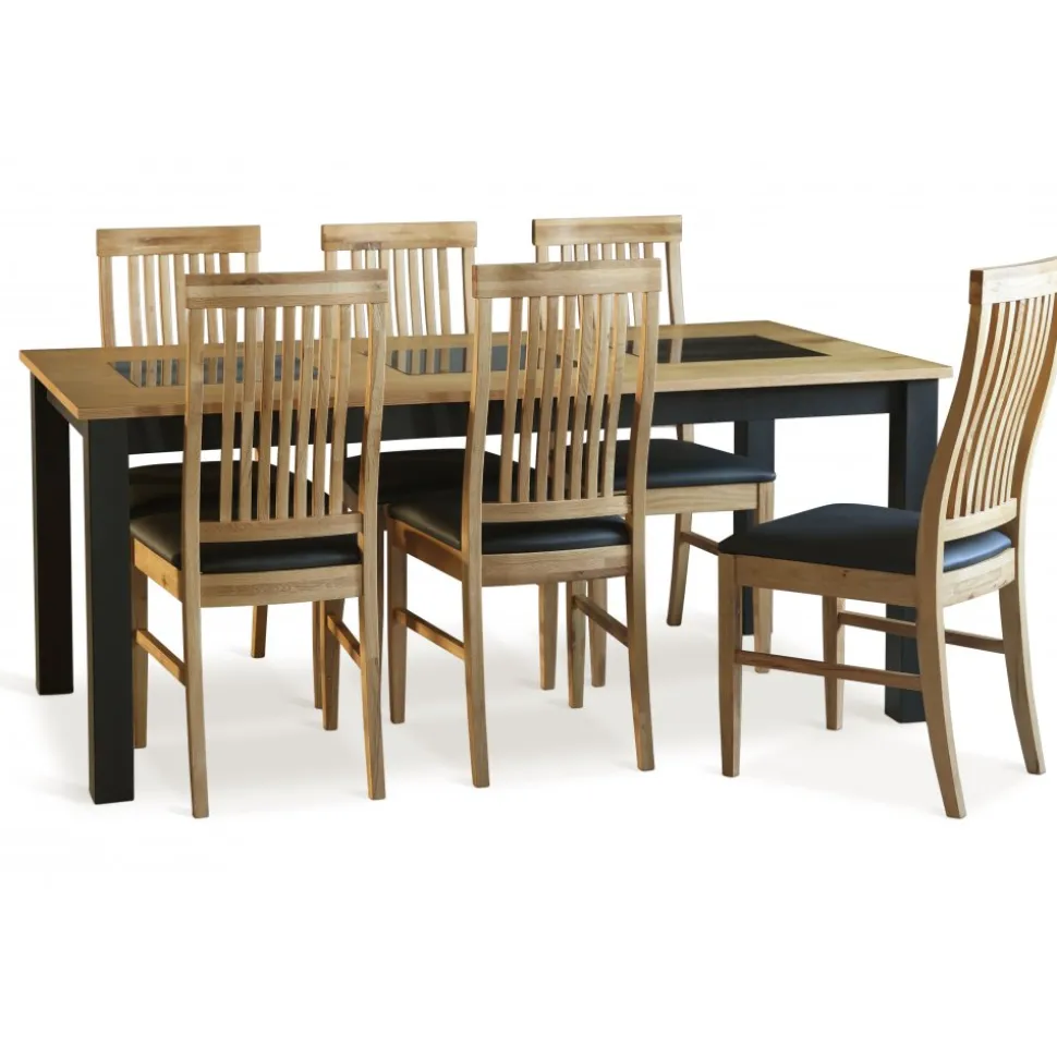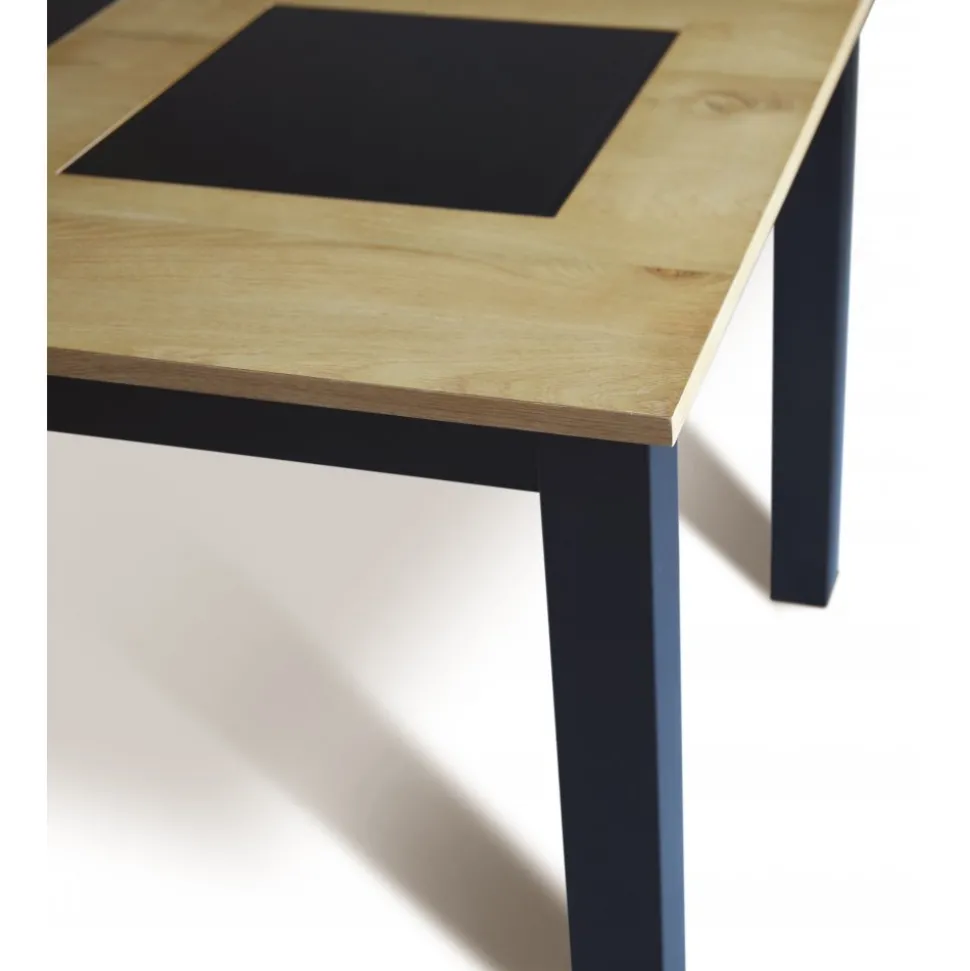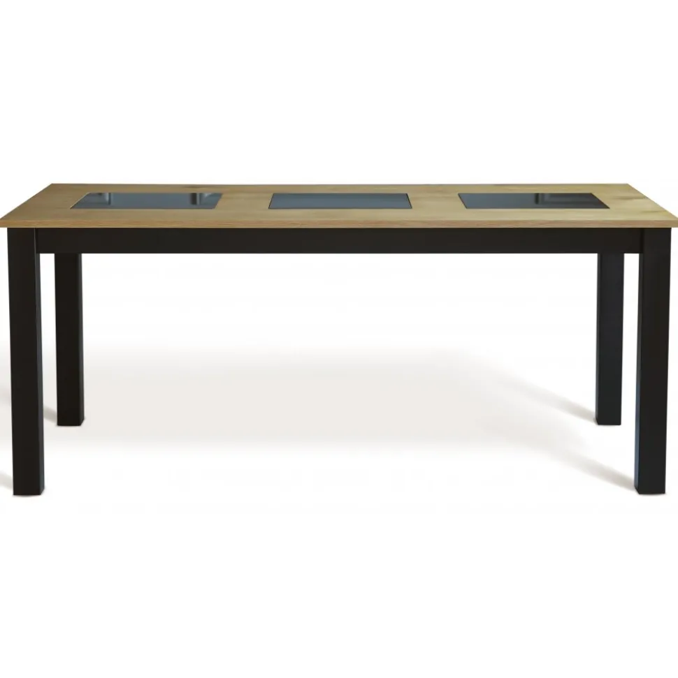 Detta eleganta matbord kombinerar modern design med gedigna material. Bordsskivan är tillverkad i ek och pryds av svarta glasplattor som ger en exklusiv och stilfull detalj. Det stabila underredet i svart ger en harmonisk kontrast och förstärker den eleganta helheten.