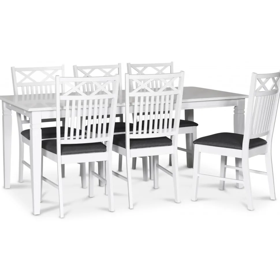Sandhamn är ett klassiskt med vitlackat underrede och bordsskiva. Bordet är 95 cm brett för att få extra mycket plats för matgästerna.