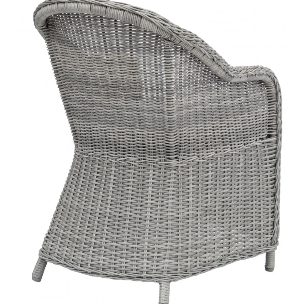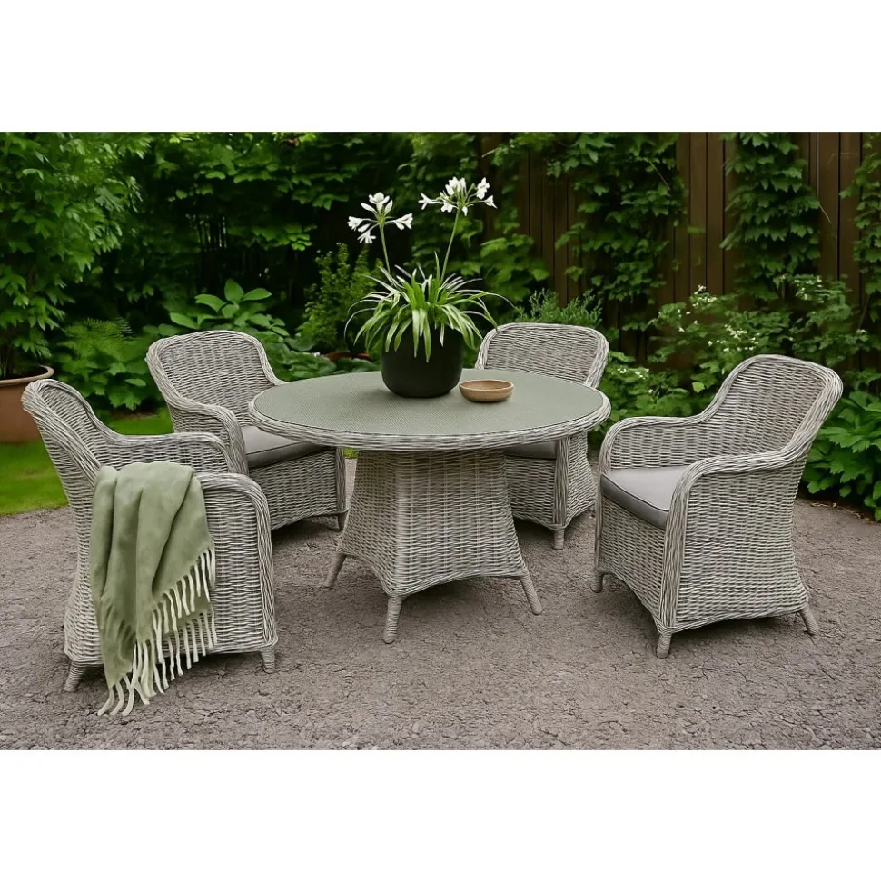Matgruppen har ett runt bord i grå konstrotting med en robust aluminiumstomme och en stilren glasskiva som passar både ute- och inomhusmiljöer. Bordet kompletteras med bekväma fåtöljer som är tillverkade i grå konstrotting och har en stabil metallstomme. Fåtöljerna har en mörkgrå polyesterdyna för extra komfort, dock ingår inte ryggdyna, vilket ger möjlighet att anpassa efter egna önskemål. Bordet tillhör Jacksonville-serien och fåtöljerna kommer från Mercury-serien.