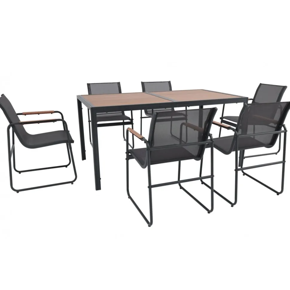 Utegrupp Lagun med bord av svartlackad metall. Matgruppen innehåller 6 st stolar med armstöd och textilen för att ge en skön och följsam komfort.
