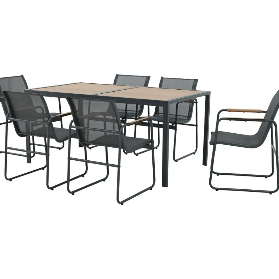 Utegrupp Lagun med bord av svartlackad metall. Matgruppen innehåller 6 st stolar med armstöd och textilen för att ge en skön och följsam komfort.