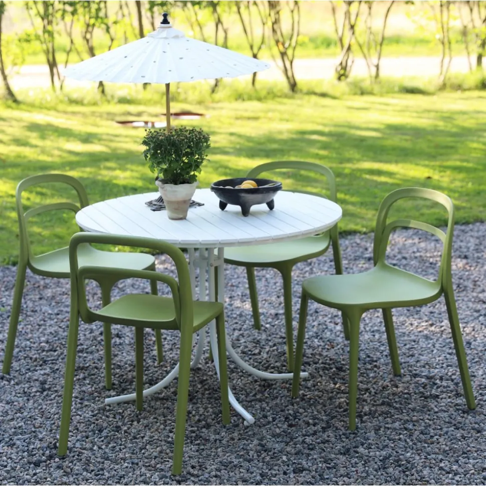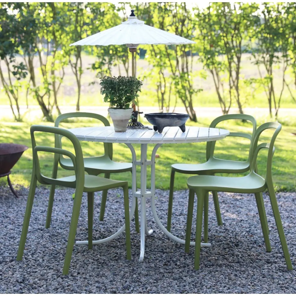 En nätt matgrupp till uteplatsen från Skånska Möbelhuset. Holmsund runt matbord Ø103 cm i diameter med vitlackat underrede och vit aintwood toppskiva. Till matgruppen medföljer 4 st stapelbara Nordanå stolar i grön formgjuten plast. En matgrupp i harmoni där möblerna går snyggt ihop och skapar en helhet som är svåröverträffad. Passar lika bra i uterummet som på altanen.