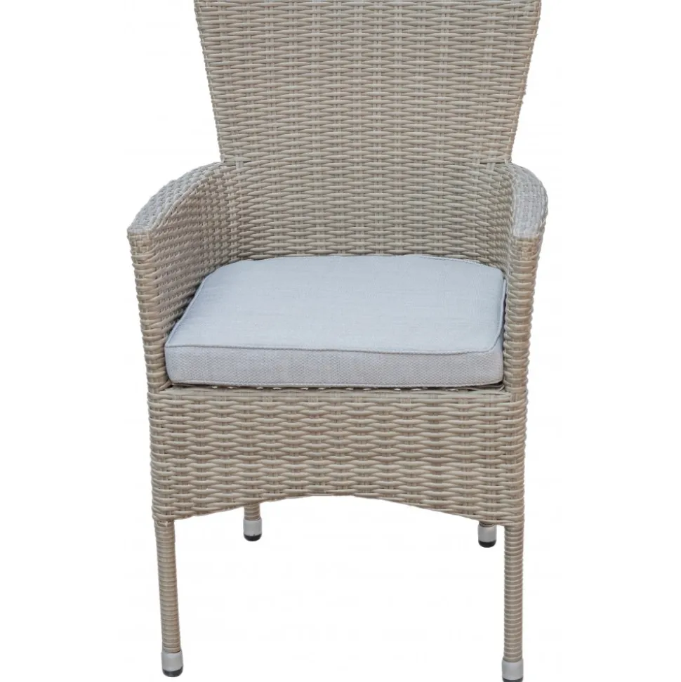 Fåtöljerna är från Tor-serien och har en praktisk design med naturfärgad konstrotting. De är utrustade med en 5 cm hög beige dyna som ger bekväm sittkomfort, vilket gör dem lämpliga både som matstolar och för avkoppling utomhus.