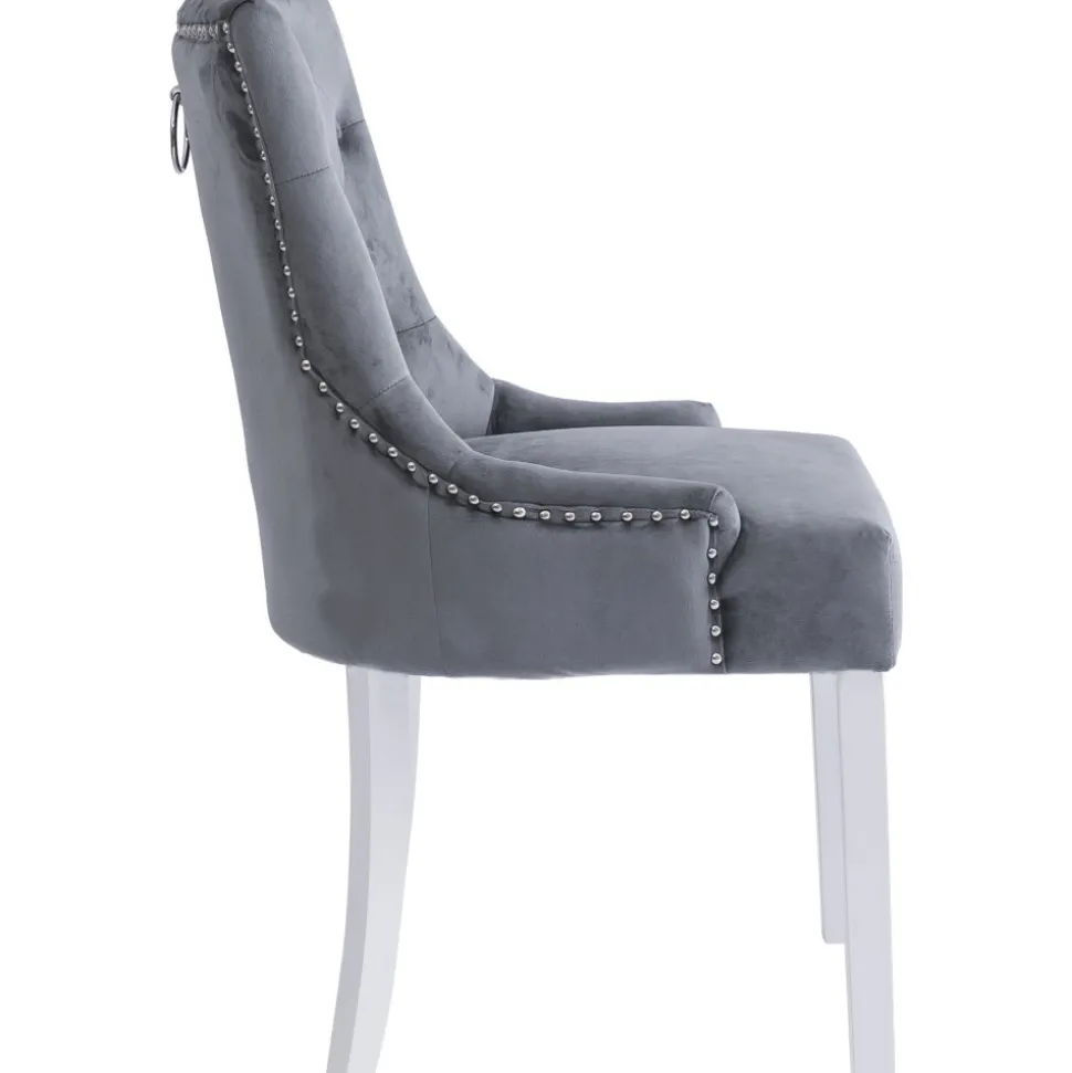 Matstol klädd i ett mjukt och lent sammetsliknande grått tyg med vitlackade ben. Stolen pryds av kromade nitarna som en snygg detalj! Stolen är välarbetad och en av våra mest populära .