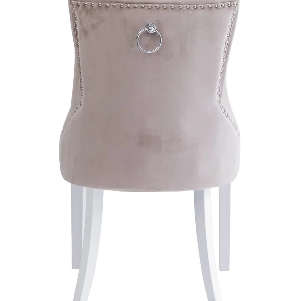 Matstol i beige sammet med kromade nitar och ring-handtag i ryggen. Matstolen har vitlackade träben. Varje är noggrant välarbetad för att säkerställa både kvalitet och hållbarhet. Tuva-stolen är mer än bara en matstol; den är en inredningsdetalj som lyfter hela din matplats. Perfekt för både vardagligt bruk och festliga tillfällen när du vill bjuda in till gemenskap och stil.