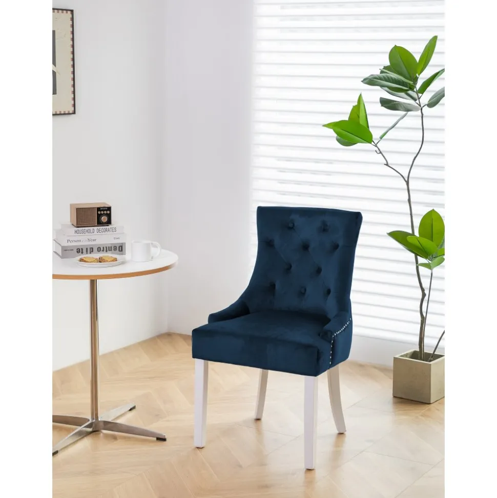 Tuva klädd i ett mjukt och lent sammetsliknande blå tyg med vitlackade ben. Stolen pryds av kromade nitarna som en snygg detalj. Stolen är välarbetad och en av våra mest populära .