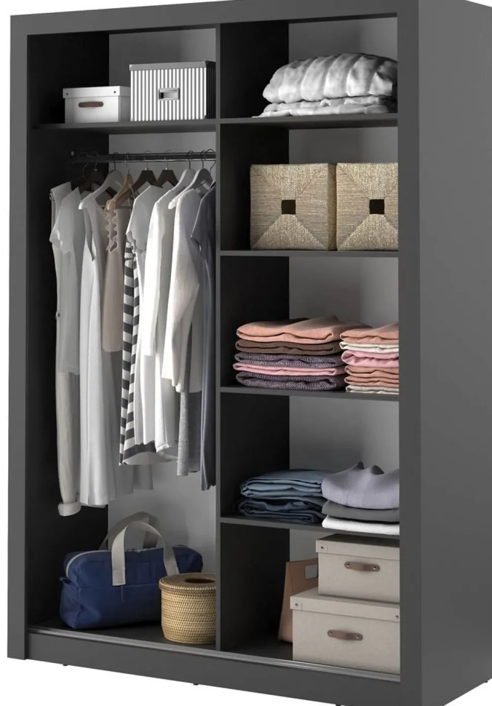 En snygg och mycket rymlig med en modern design. Tillverkad i Chipboard och med många förvaringsmöjligheter. Bakom de två skjutdörrarna, varav en med spegel, finner du massa med utrymme, klädstång och hyllplan. Handtag av plast med blank finish. Levereras omonterad.