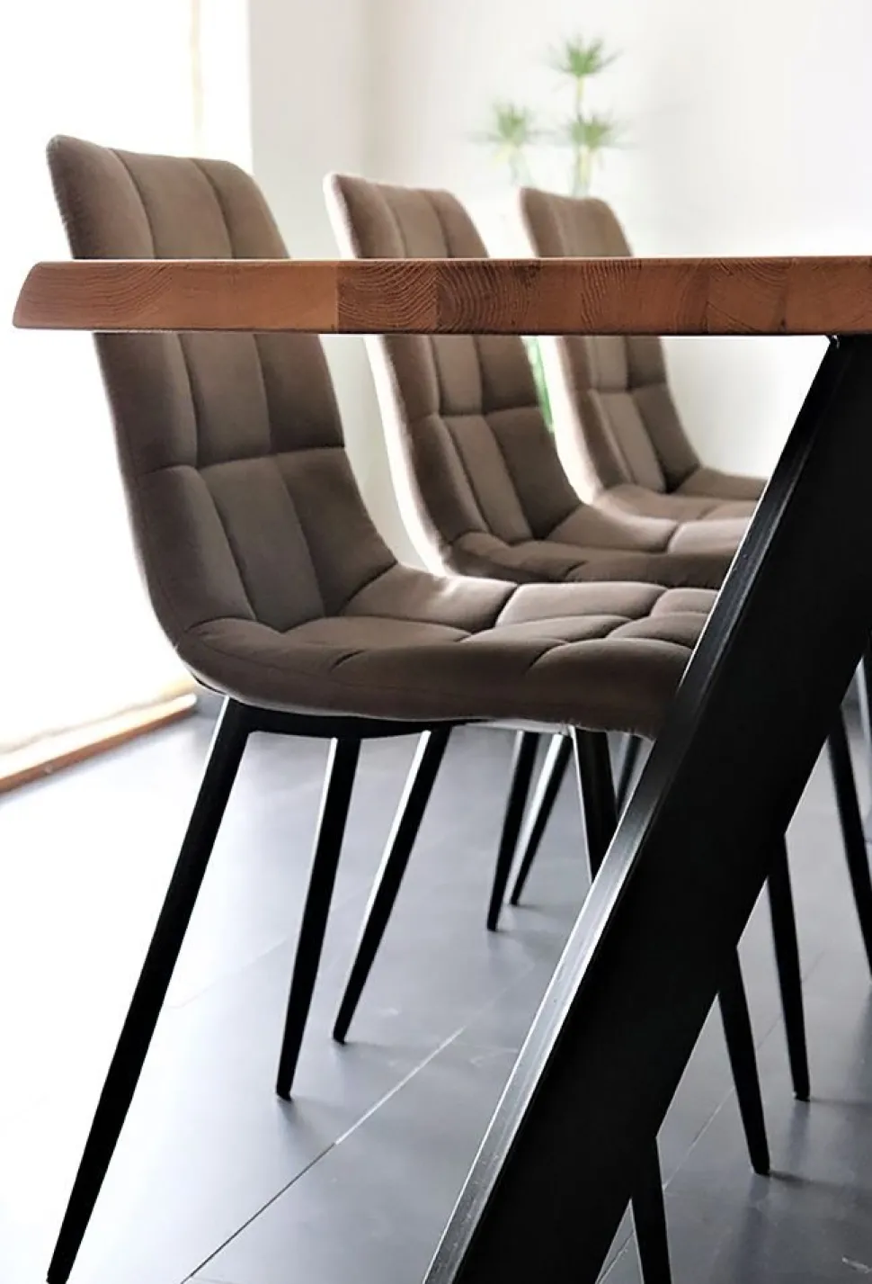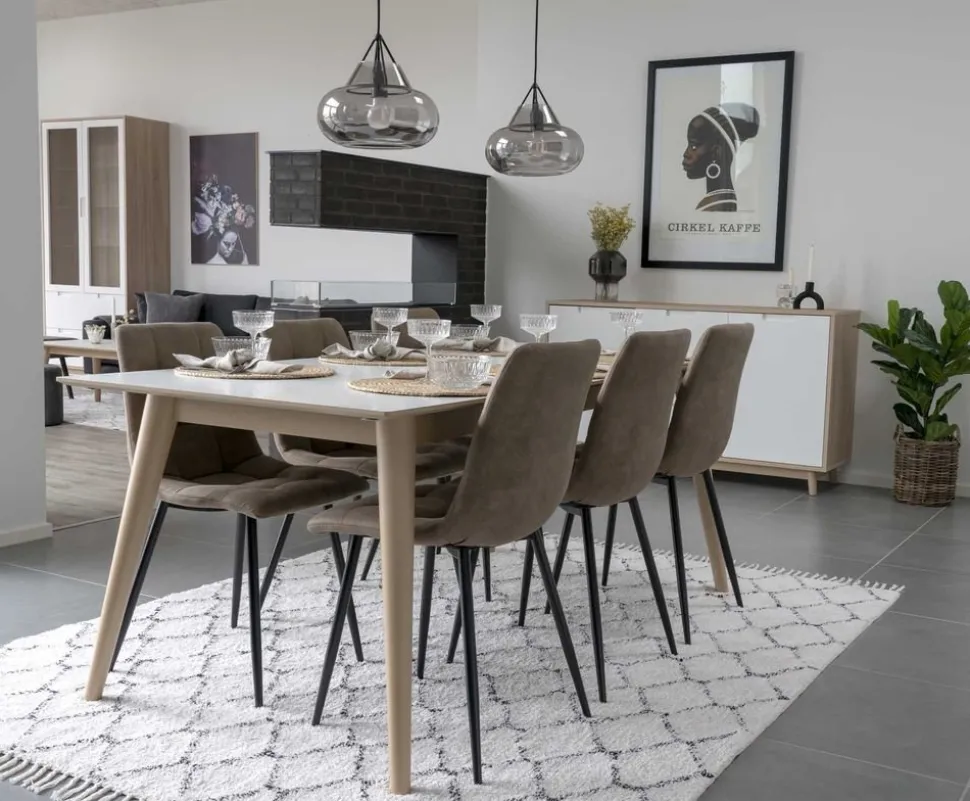 Matstolens svarta ben skapar en vacker kontrast mot den ljusbruna klädseln och förstärker möbelns moderna och eleganta estetik. De svarta benen ger också stabilitet och hållbarhet, vilket är avgörande för en stol som används dagligen.