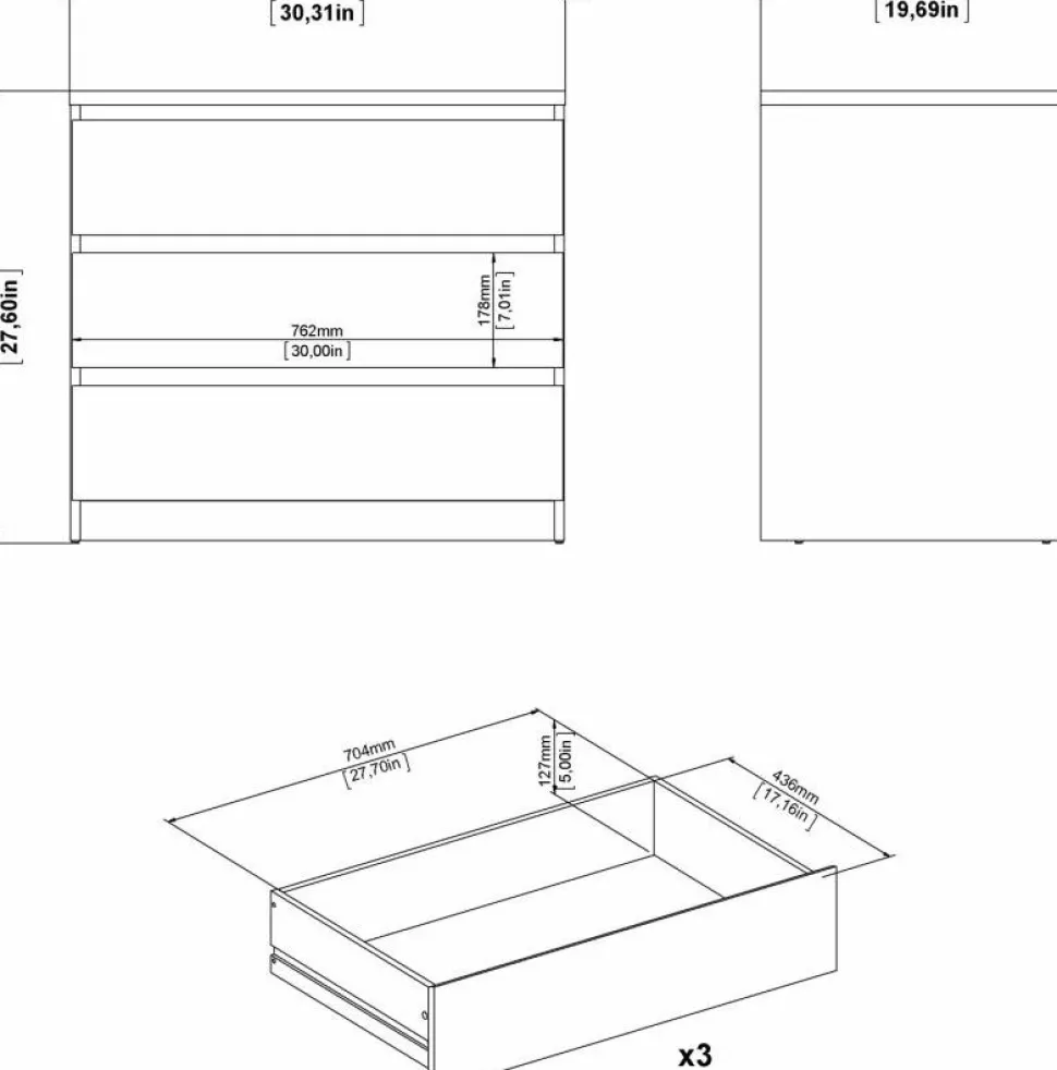Byrå av trä med kantband av melamin och ABS-plast.