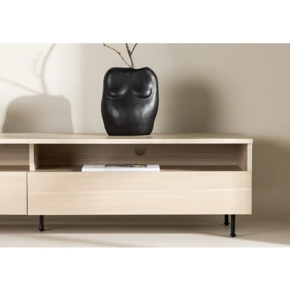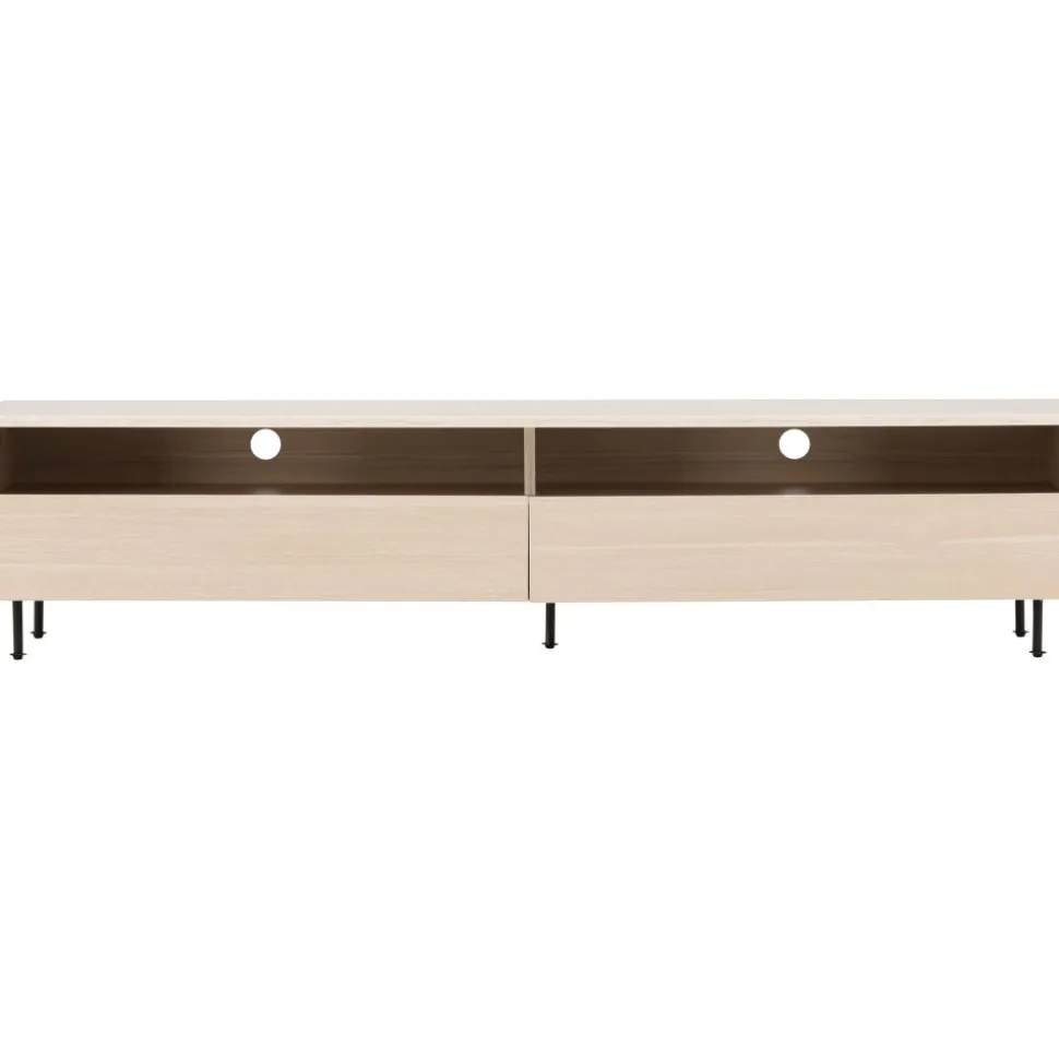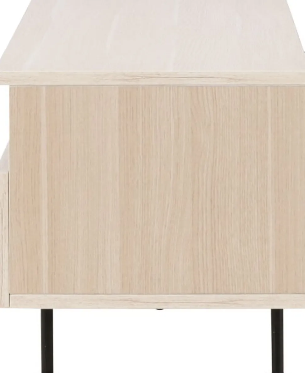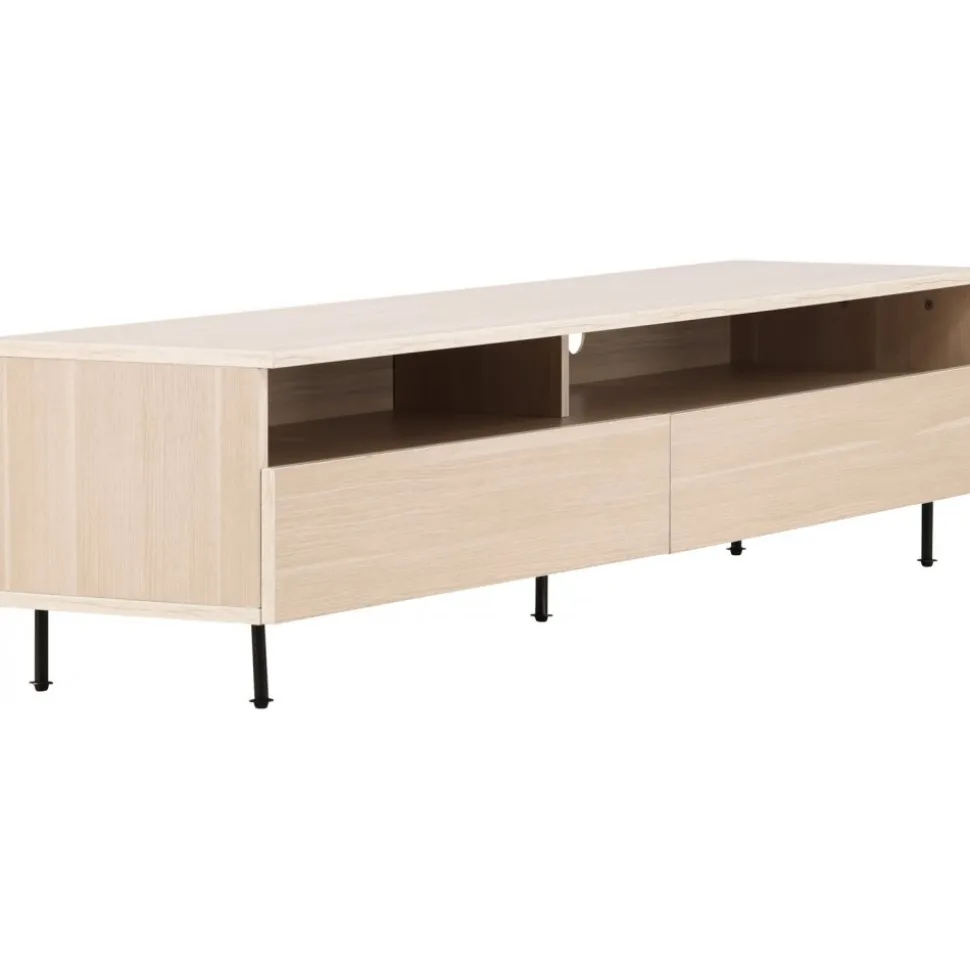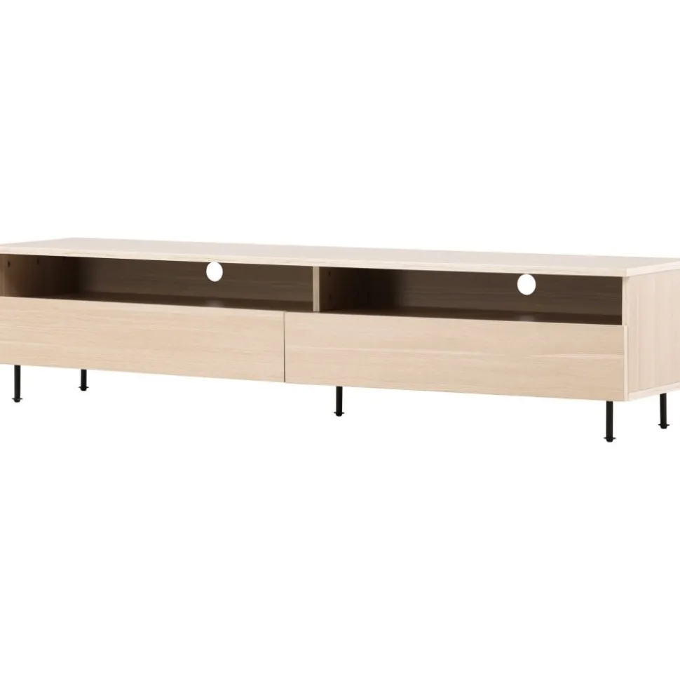 Möblera ditt vardagsrum i den nordiska stilen med vår lyxiga Tv-bänk i vitputsad kulör från serien Navarra! Denna underbara möbel med en hållbar yta av vitputsat melamin imponerar verkligen med sin moderna stil och smarta förvaringslösningar. Navarra har två rymliga lådor, perfekta för att diskret röja undan allt från fjärrkontroller till favoritböckerna. De öppna hyllfacken ovanför ger dig flexibilitet att visa upp något vackert föremål eller låta de mest använda prylarna vara nära till hands. Skapa sedan även din egen harmoni genom att pryda toppskivan med fina ljusstakar och snygga högtalare för en fulländad tv-upplevelse.Den här Tv-bänken lutar mot fyra smala ben i svart färg som lyfter upp den till en stilren nivå. Men tv-bänkens höjd ger inte bara ett lyft till din inredning utan underlättar också din städrutin – här kommer dammsugaren smidigt under och håller rent i ditt hem. Här får du verkligen en Tv-bänk som kombinerar tidlös design med smart förvaring. Upplev en känsla av lugn och organiserad lyx varje dag och bygg din soffhörna tillsammans med Navarra för en komplett Tv-hörna! Levereras omonterad.