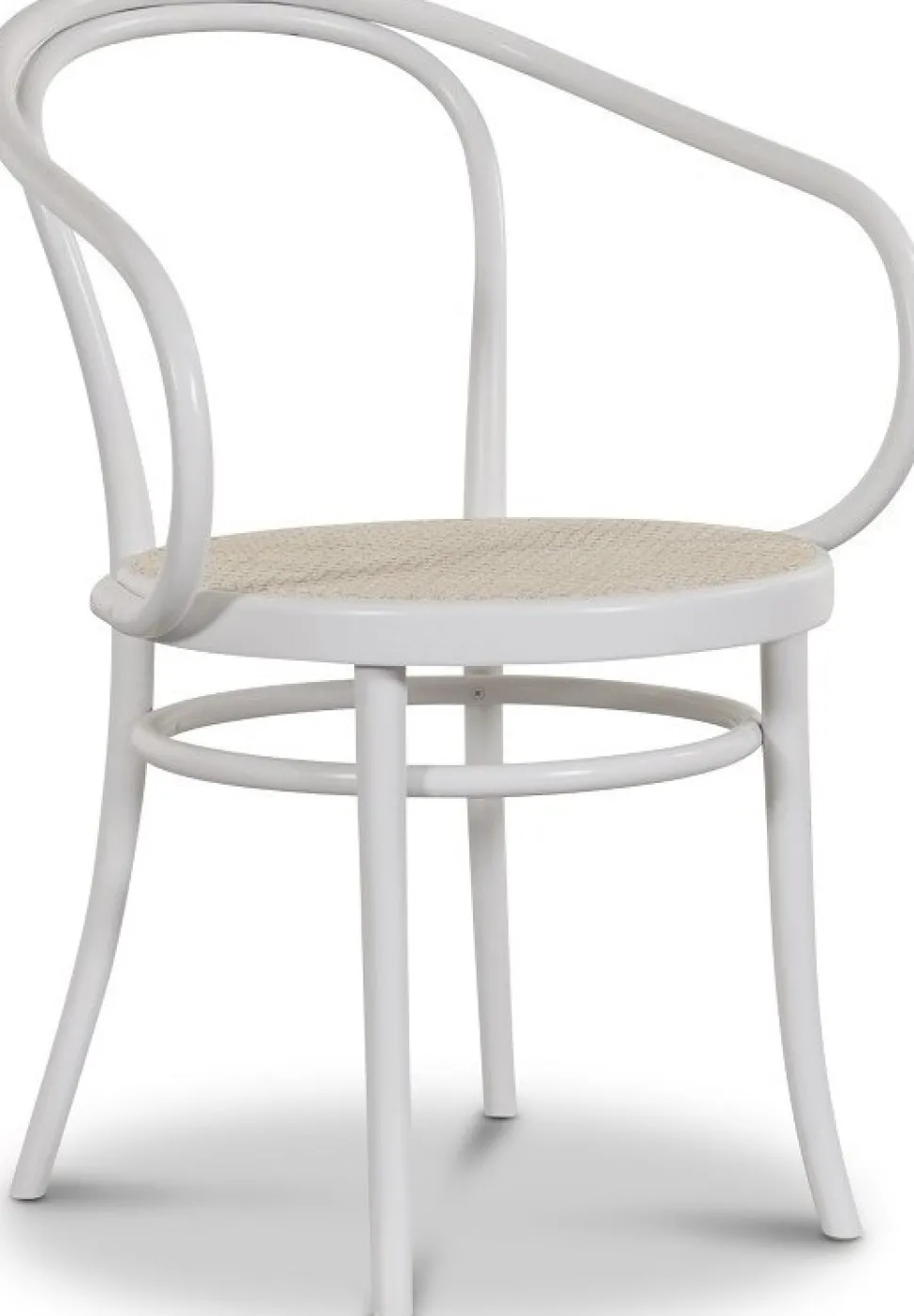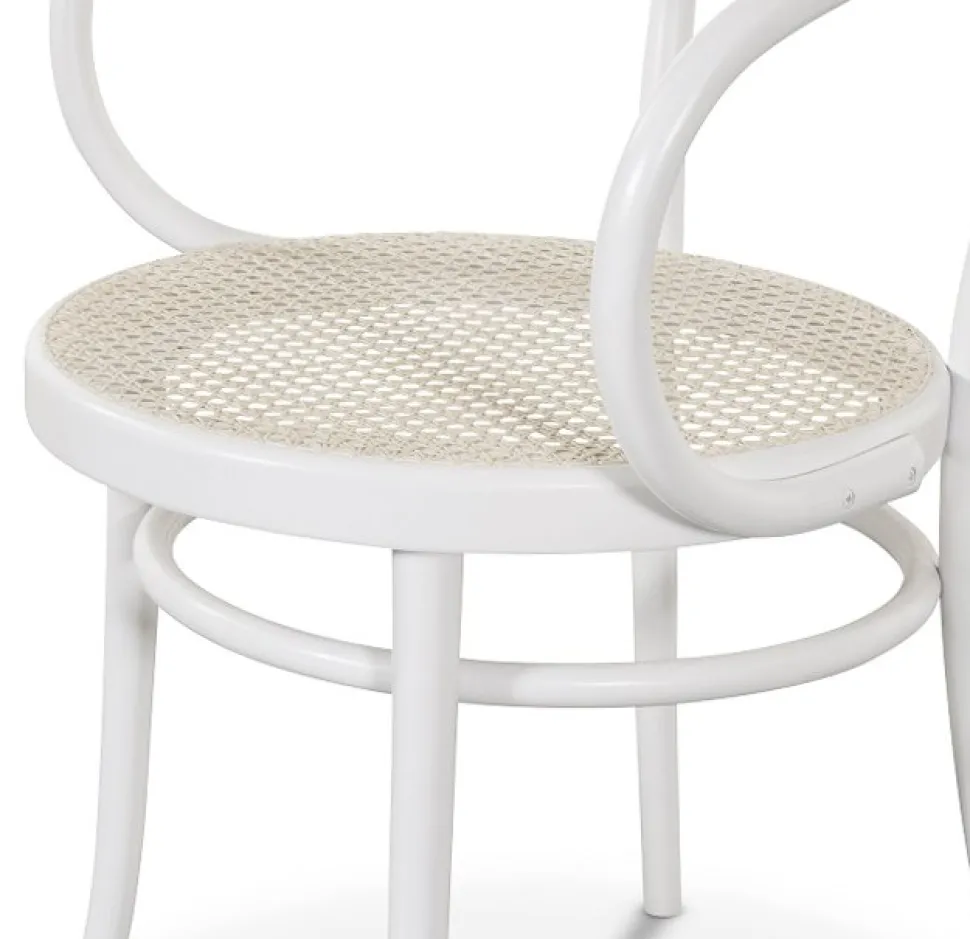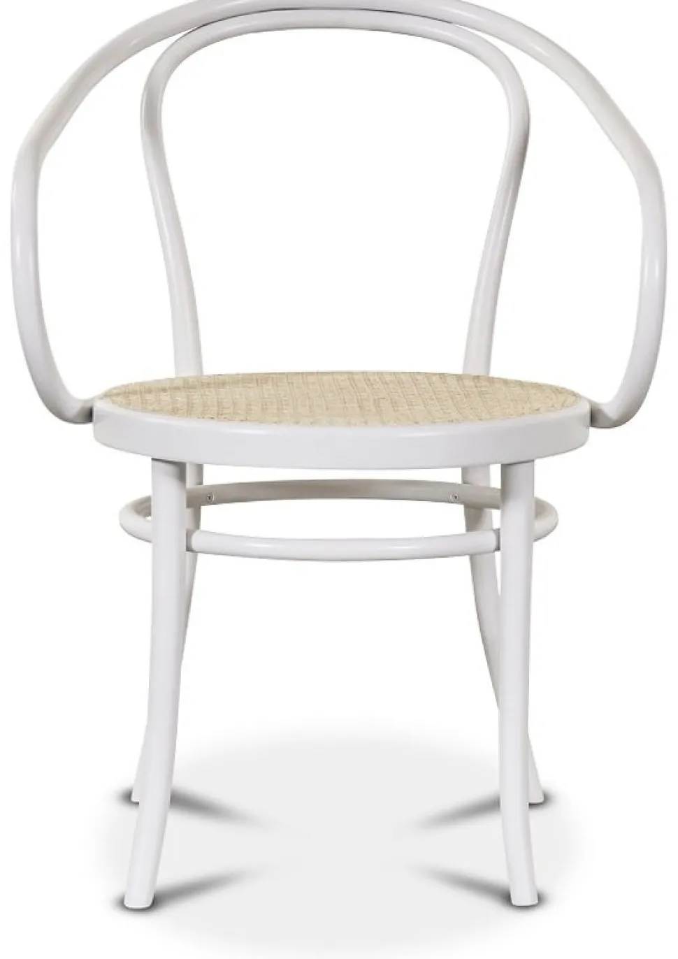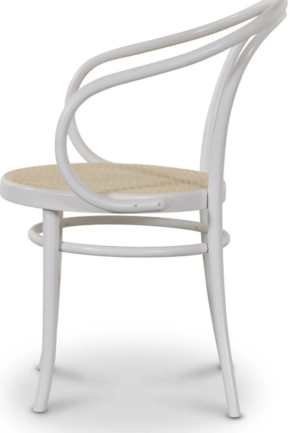 Vitlackad karmstol No 30 i böjträ med beige rottingsits. Levereras monterad och klar för användning direkt. Klassisk designikon! Passar både till modern inredning som retro och vintage! Detta är en av de kändaste stolarna enligt världens experter.