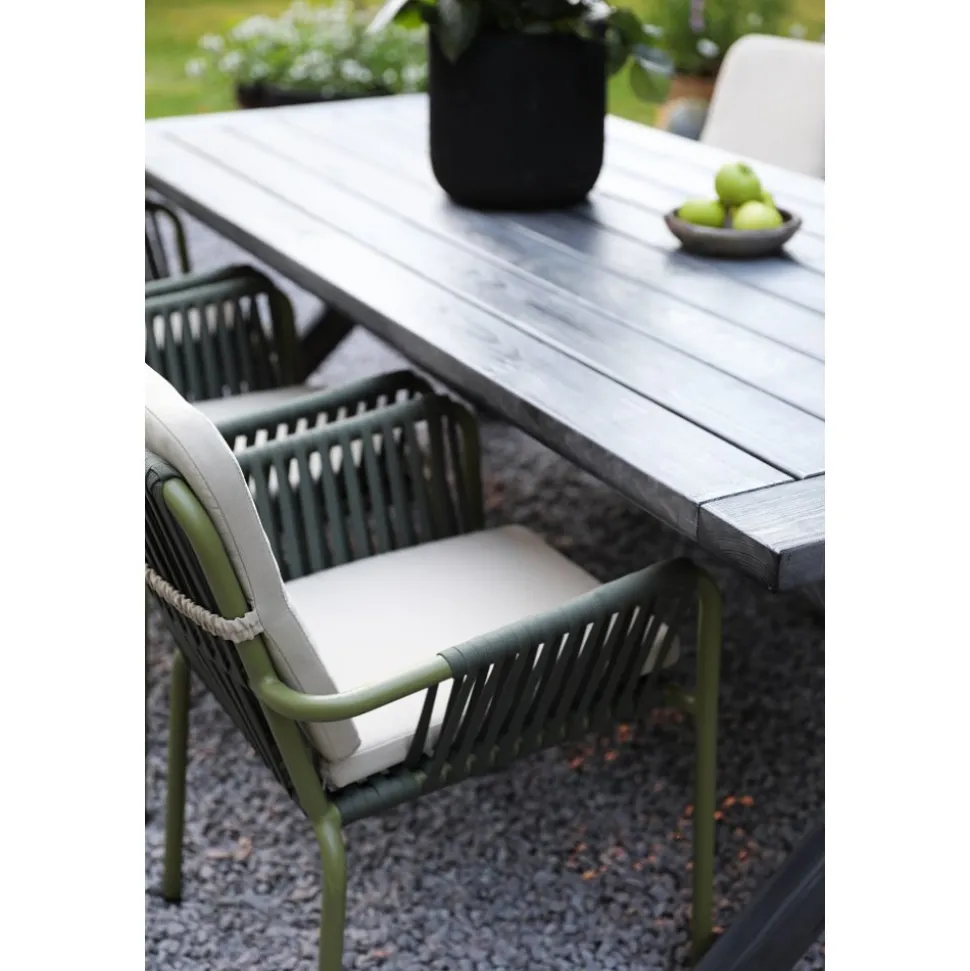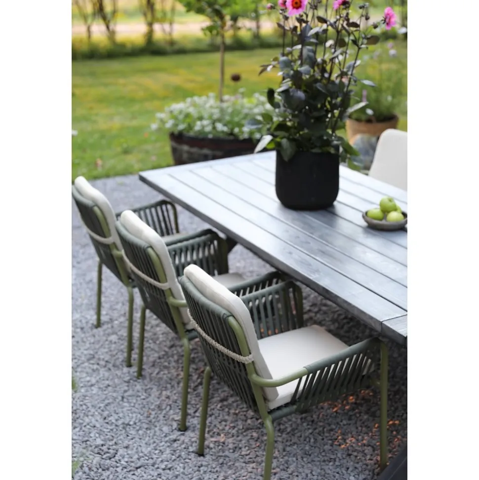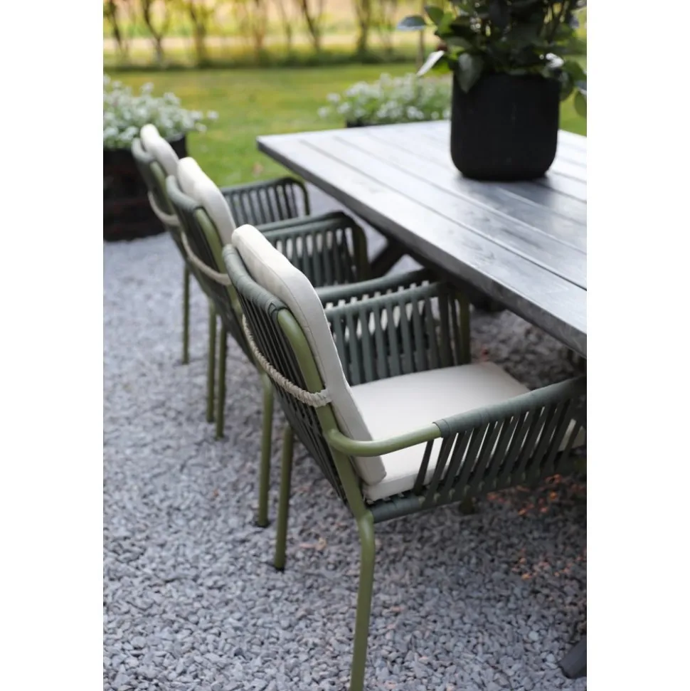 Inklusive 6 st sköna Lincoln stapelbara karmstolar i grönlackad aluminium stomme med en beioge dyna för rygg och sits. Matgruppen passar perfekt på altanen, uteplatsen och i uterummet.