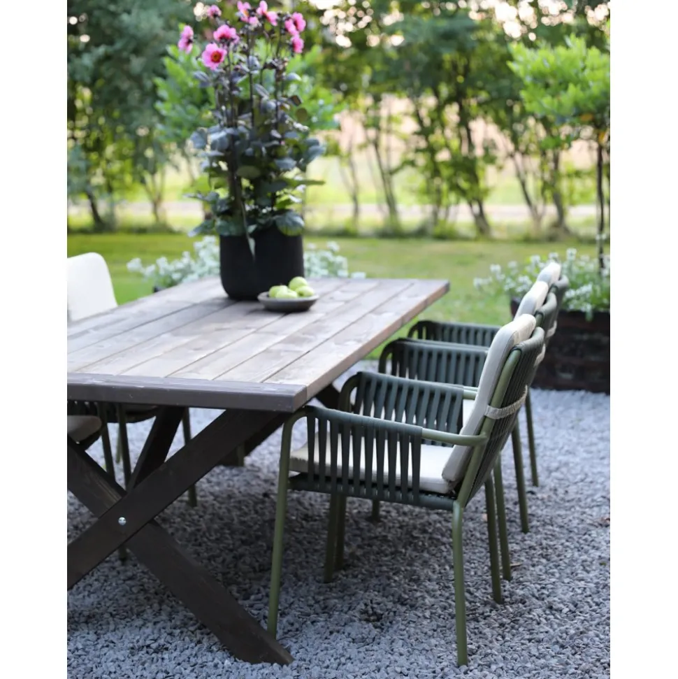Inklusive 6 st sköna Lincoln stapelbara karmstolar i grönlackad aluminium stomme med en beioge dyna för rygg och sits. Matgruppen passar perfekt på altanen, uteplatsen och i uterummet.