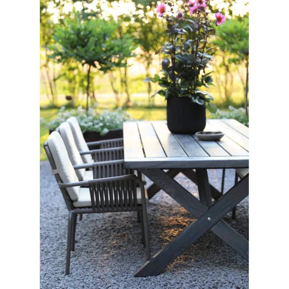 Inklusive 6 st sköna Lincoln stapelbara karmstolar i grålackad aluminium stomme med en beioge dyna för rygg och sits. Matgruppen passar perfekt på altanen, uteplatsen och i uterummet.