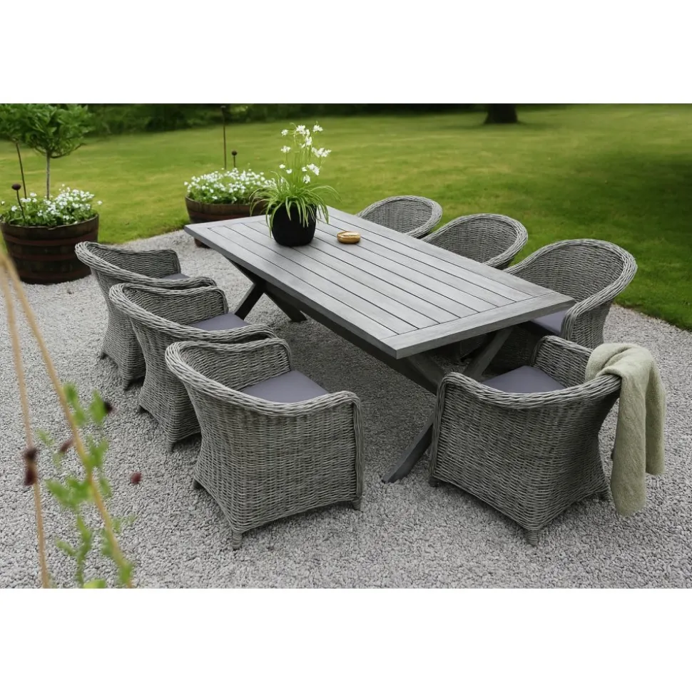 Inklusive 6 st Mercury fåtöljer i matchande grå konstrotting med sittdynor. Matgruppen passar perfekt på altanen, uteplatsen och i uterummet.