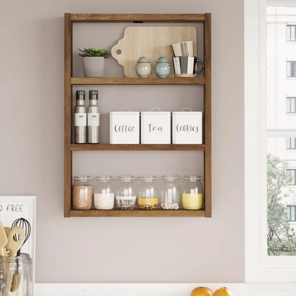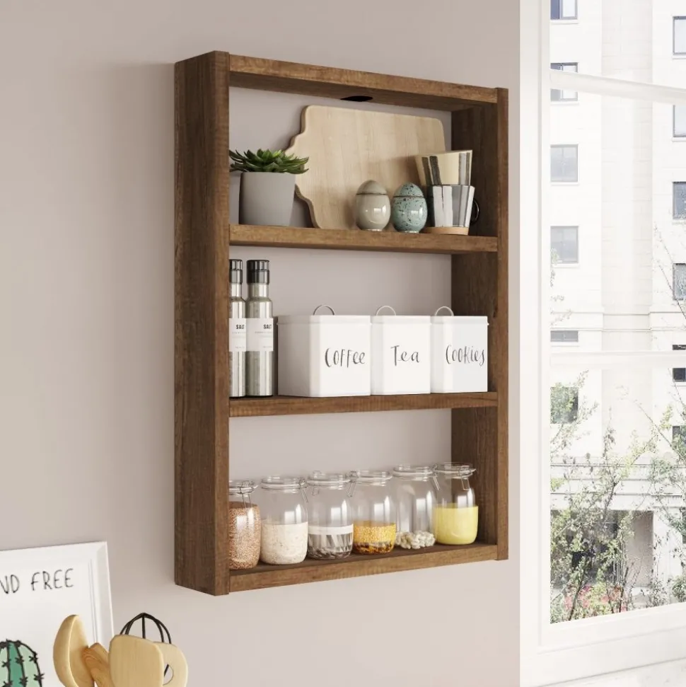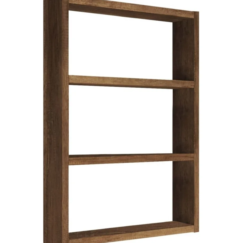 Vägghylla av melaminbelagd spånskiva.