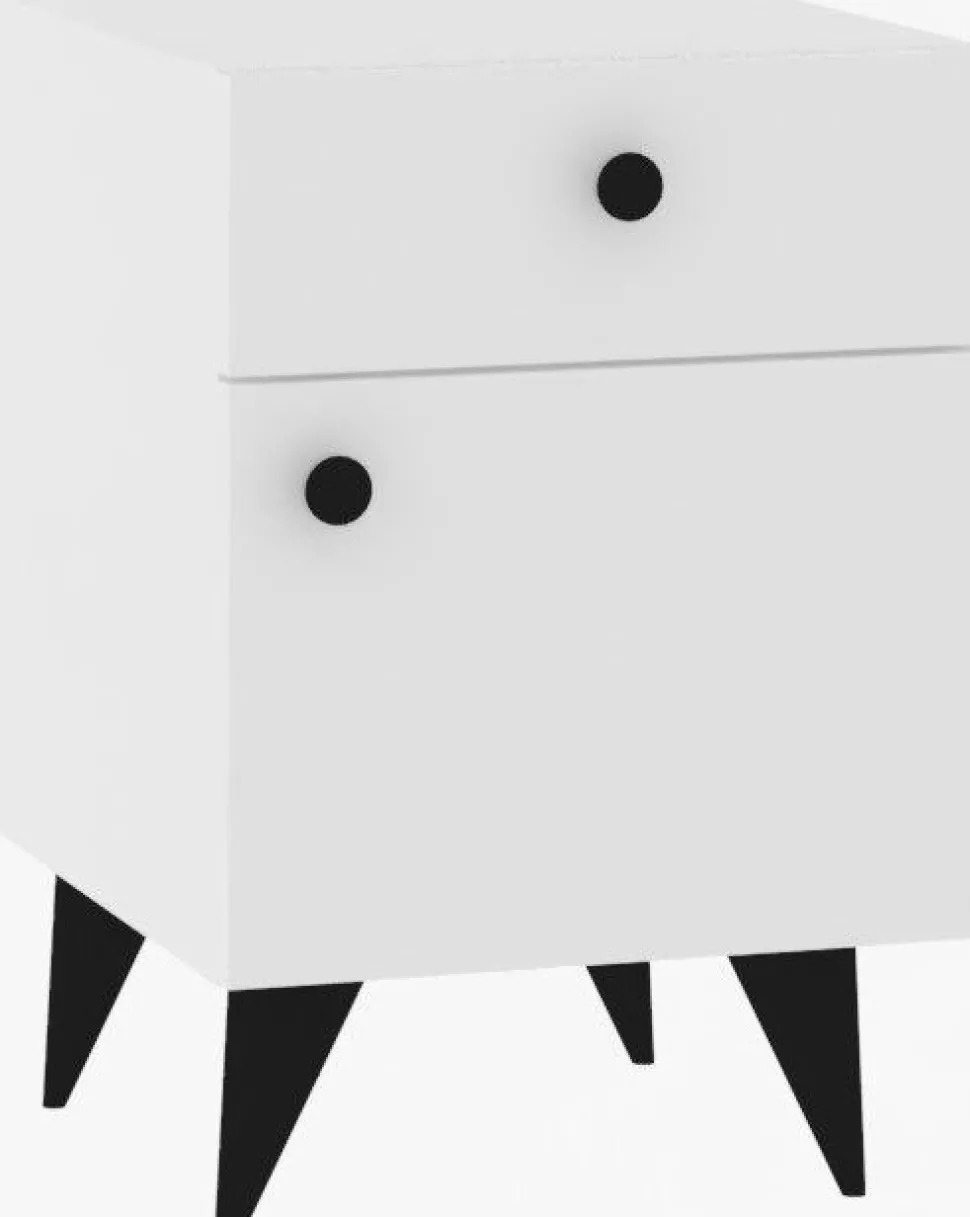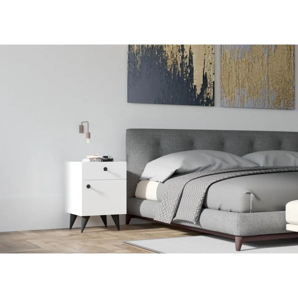Sängbord av melaminbelagd spånskiva.