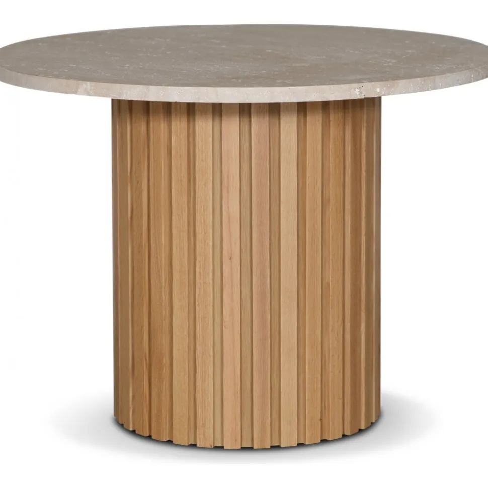 Vår PiPi bordsserie står för hantverk, design och hållbarhet. Vi erbjuder valnöt, whitewash, svartbetsat trä och ek. Serien innehåller olika storlekar och utföranden. Välj just ditt utförande för matplatsen. Denna modellen har en snygg rund toppskiva i äkta travertin kalksten. Alla travertin stenar är unika med dess mönster och håligheter för att ge den naturliga känslan.