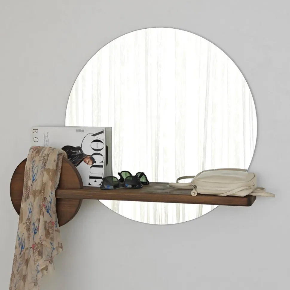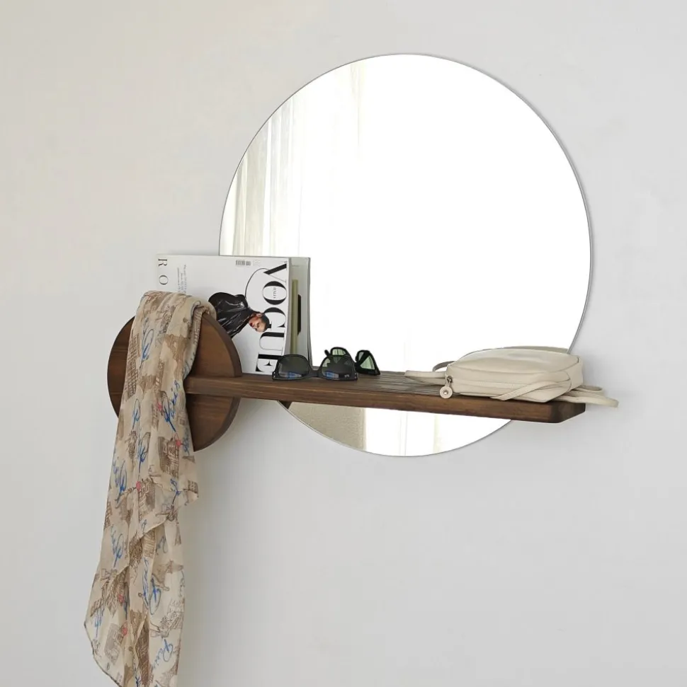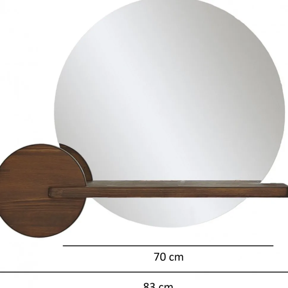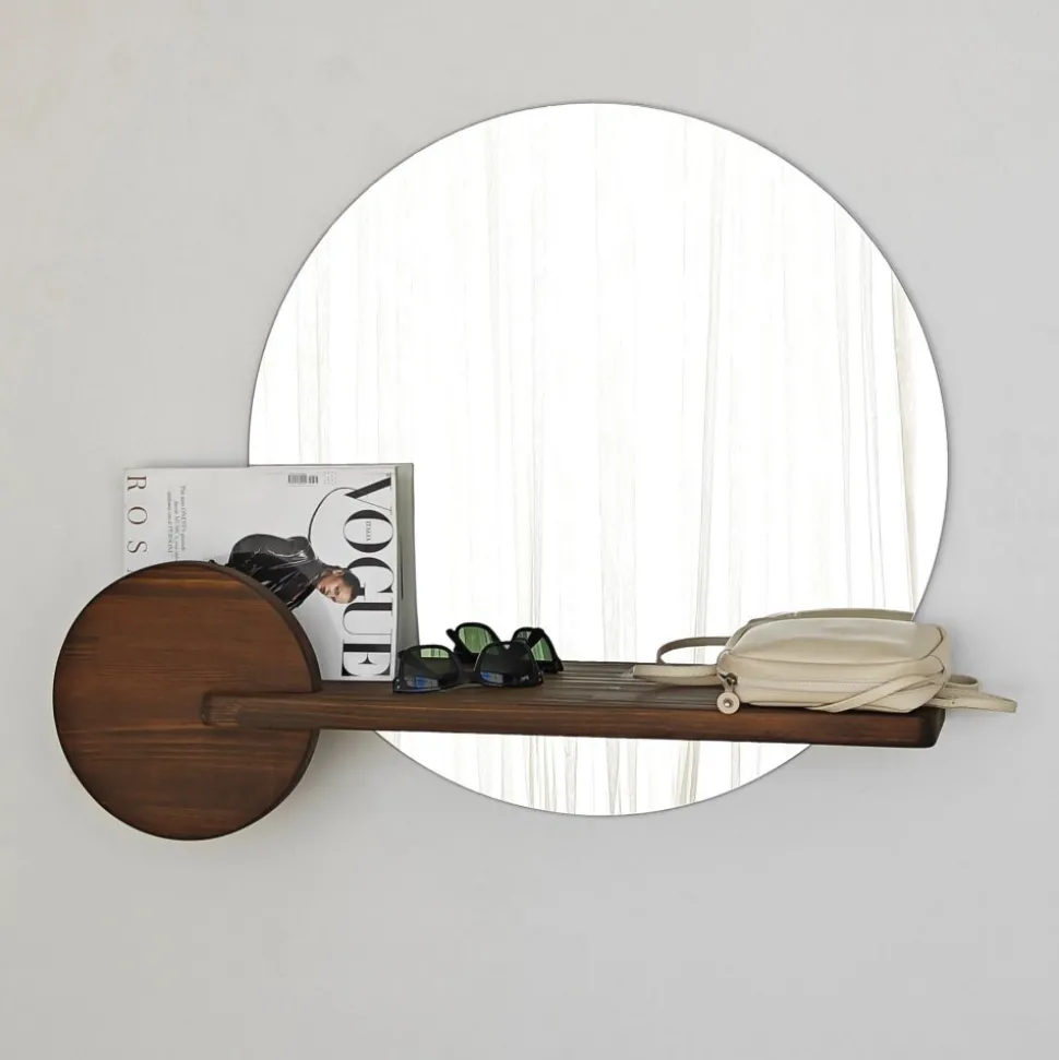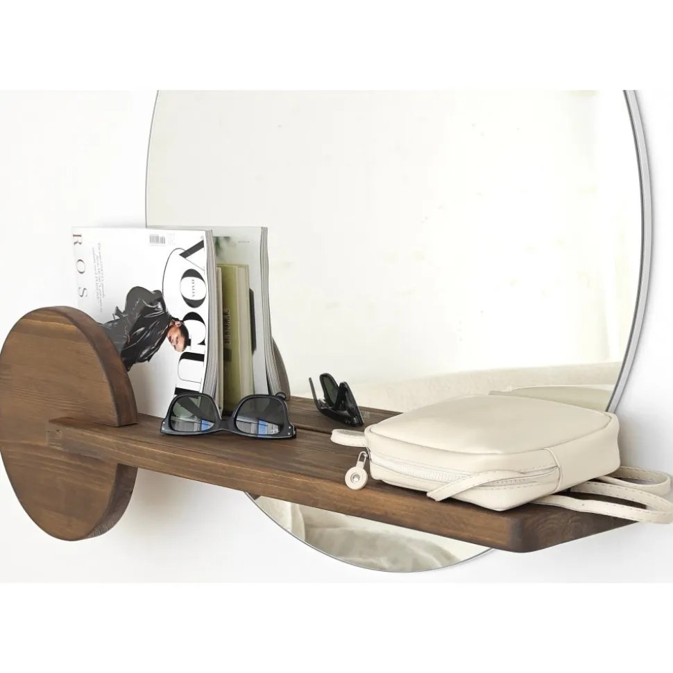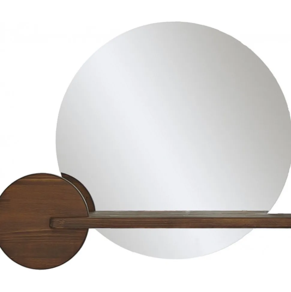 Väggspegel av koppar- och blyfritt glas med integrerad hylla av trä.