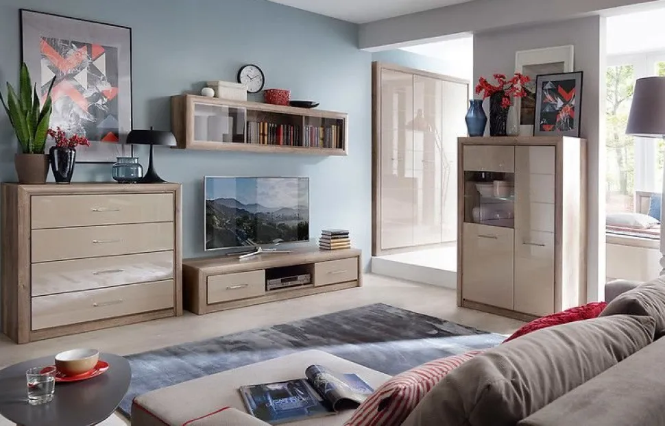 En praktisk i ek med tre dörrar där fronterna är beigea. Garderoben är har en klädstång med ett hyllplan ovanför och i den högra sektionen har man endast hyllplan vilket gör garderoben mycket funktionell och det blir enkelt att hålla ordning bland dina kläder.