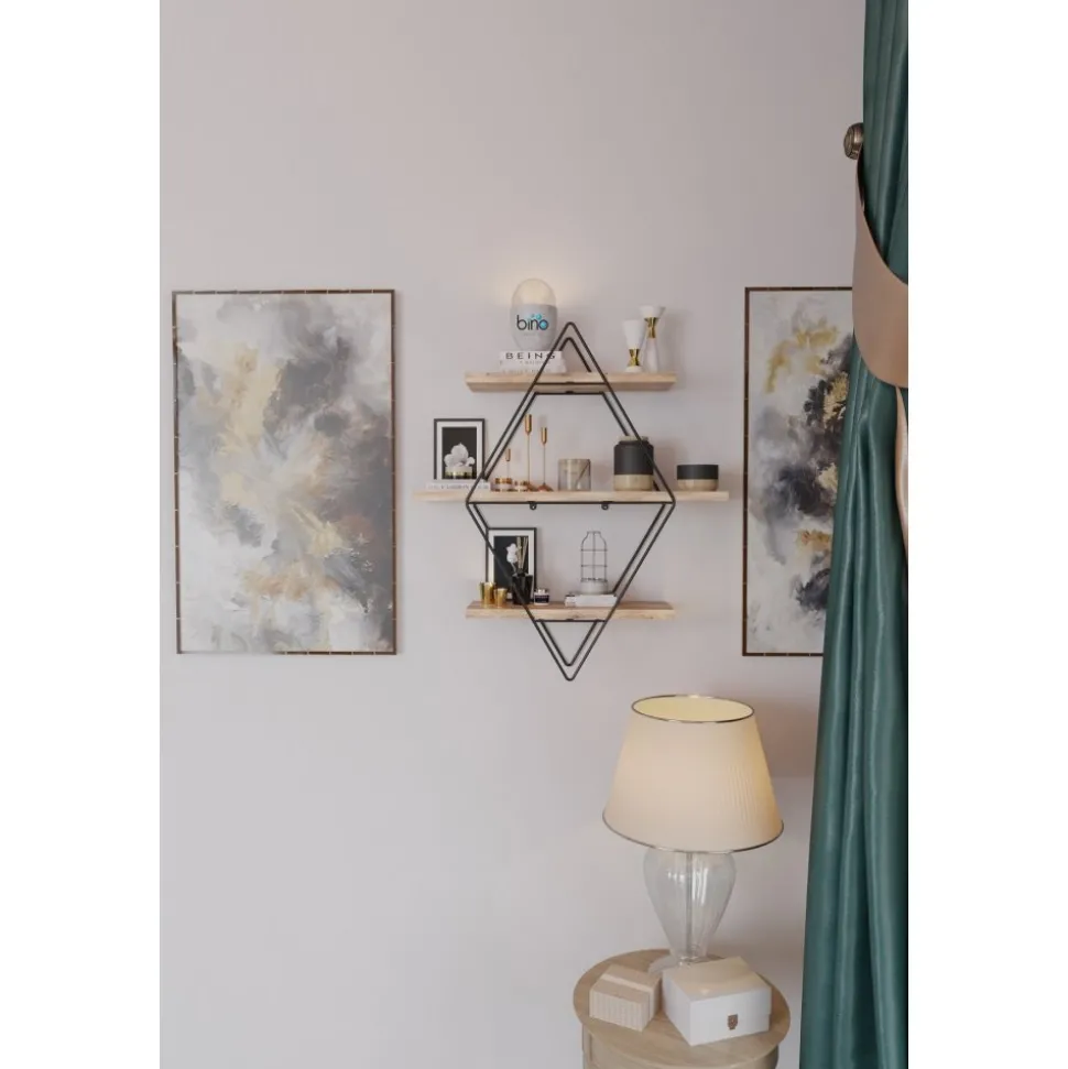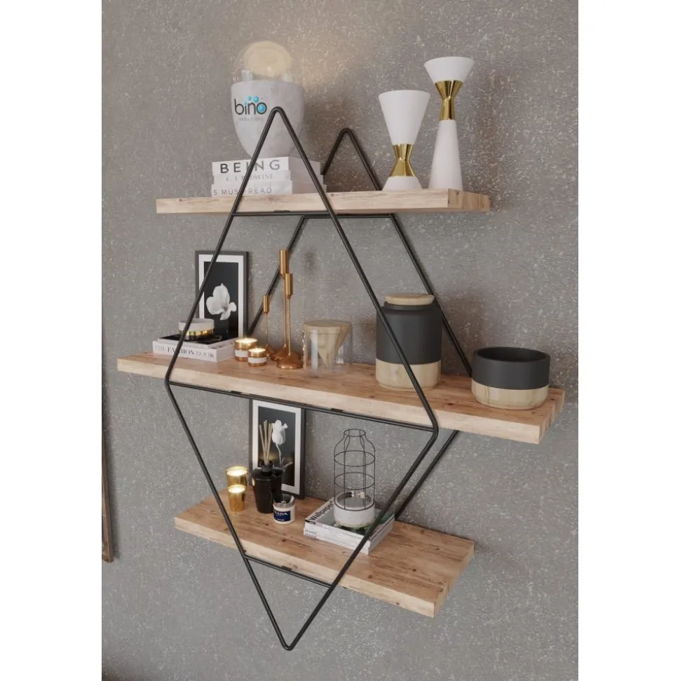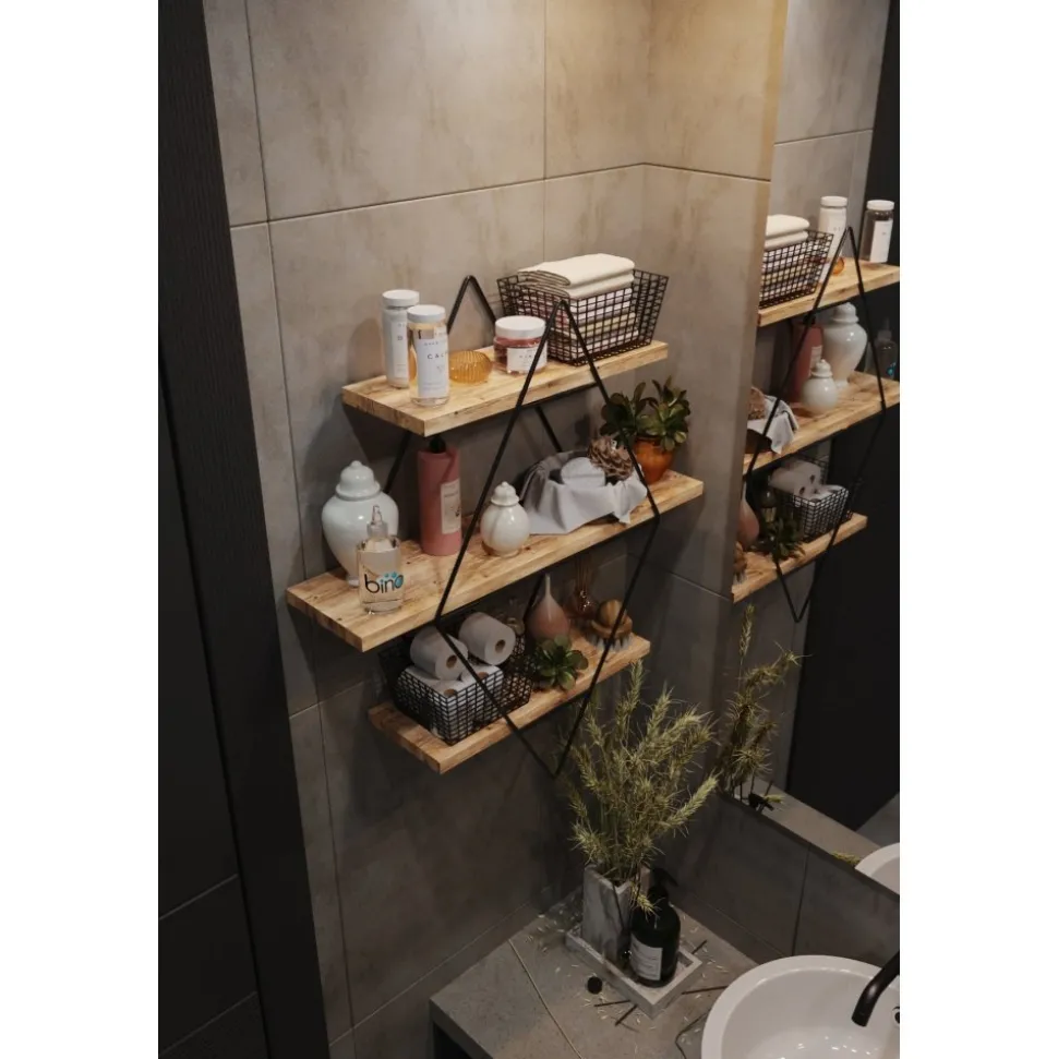 Vägghylla av trä och metall. Eftersom produkten innehåller obearbetat trä kan produkten skilja i nyans och mönster mot bilden.