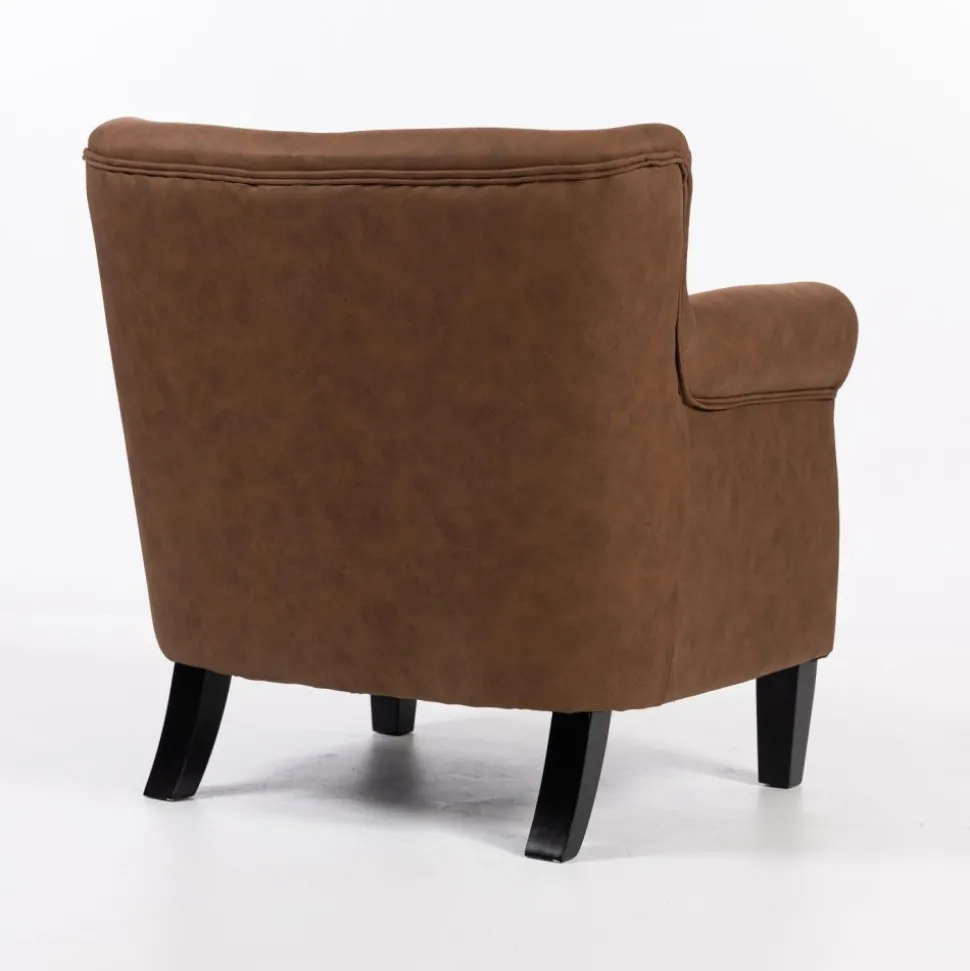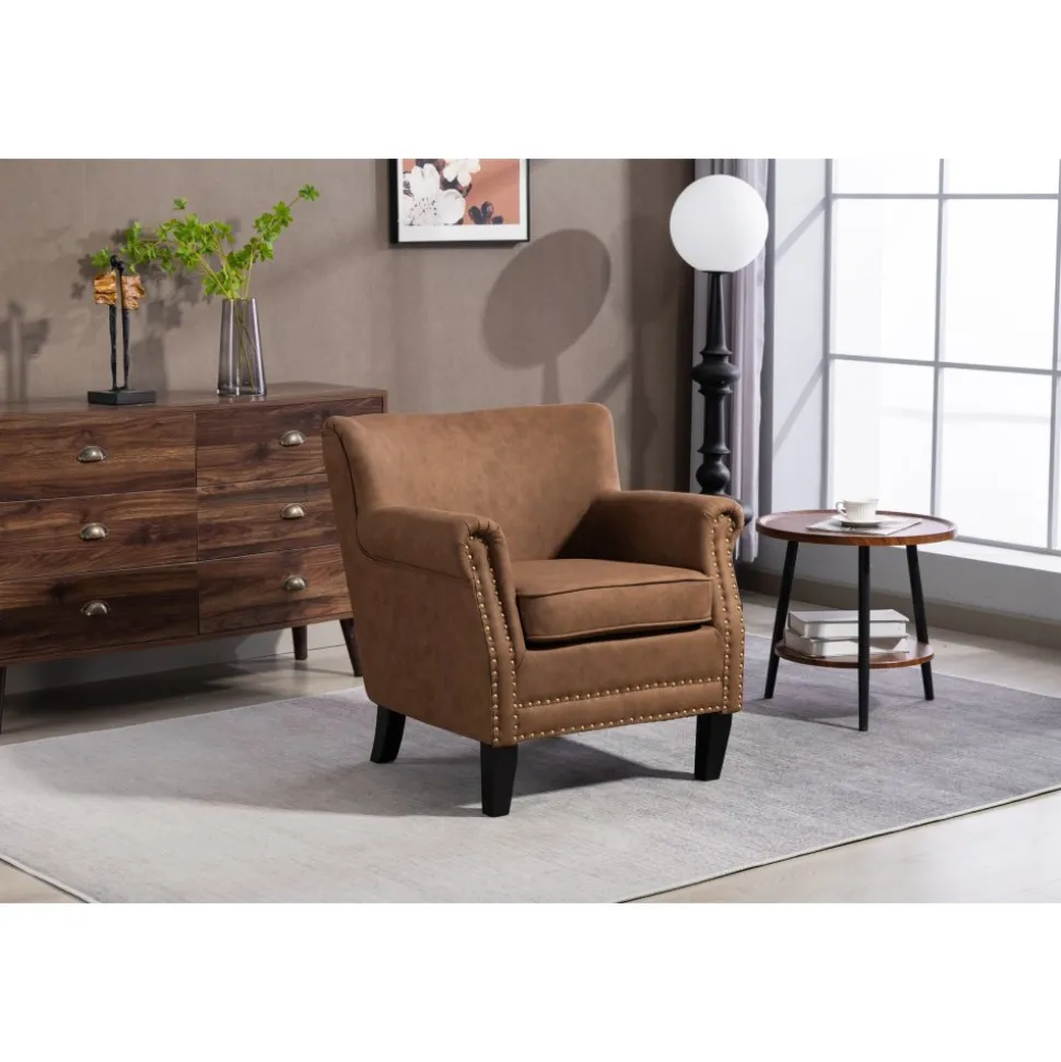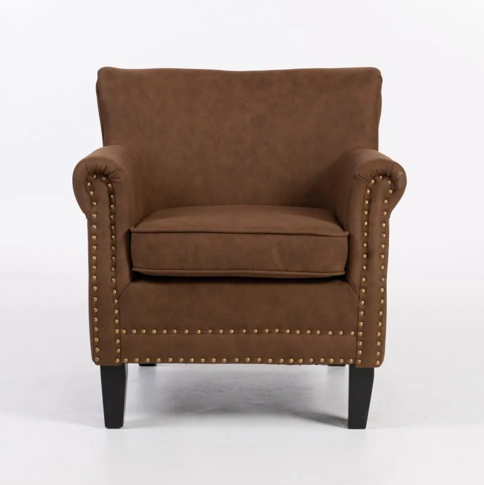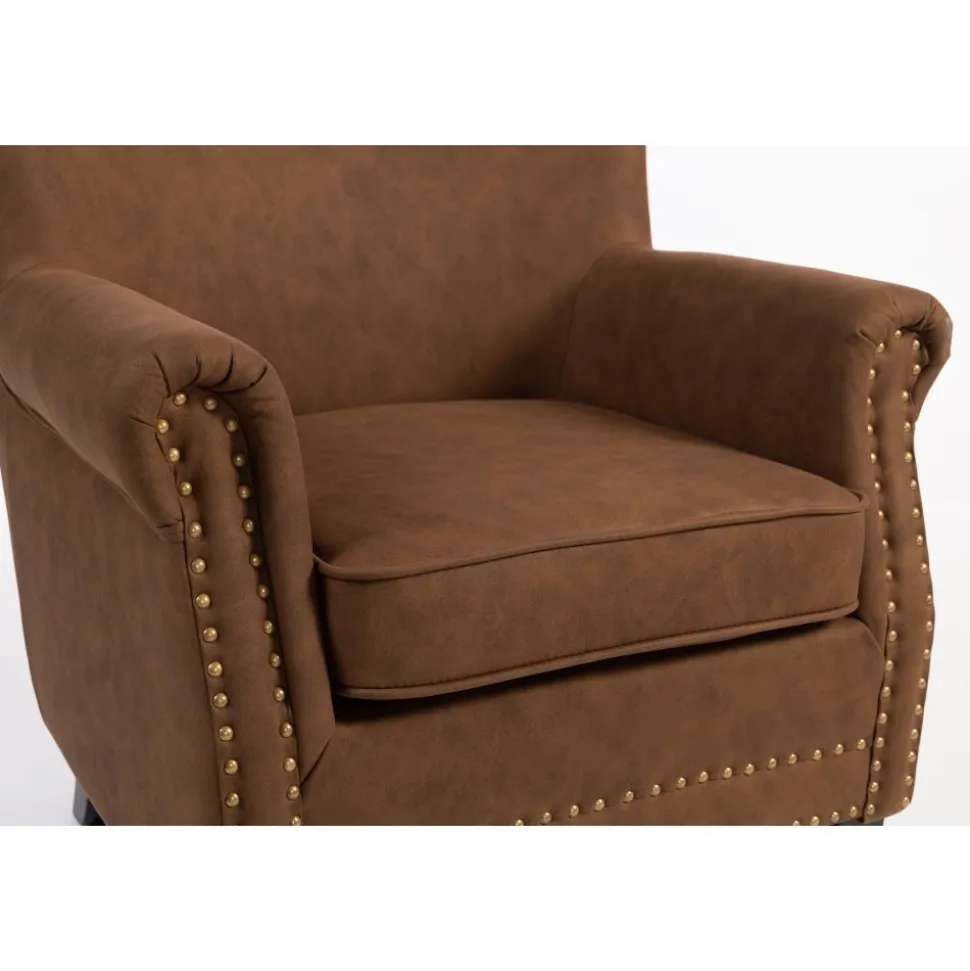 Elegant professorfåtölj klädd i brunt konstläder (PU) med dekorativa nitar på framsidan. Fåtöljen står stadigt på svarta ben och levereras färdigmonterad redo att användas direkt.