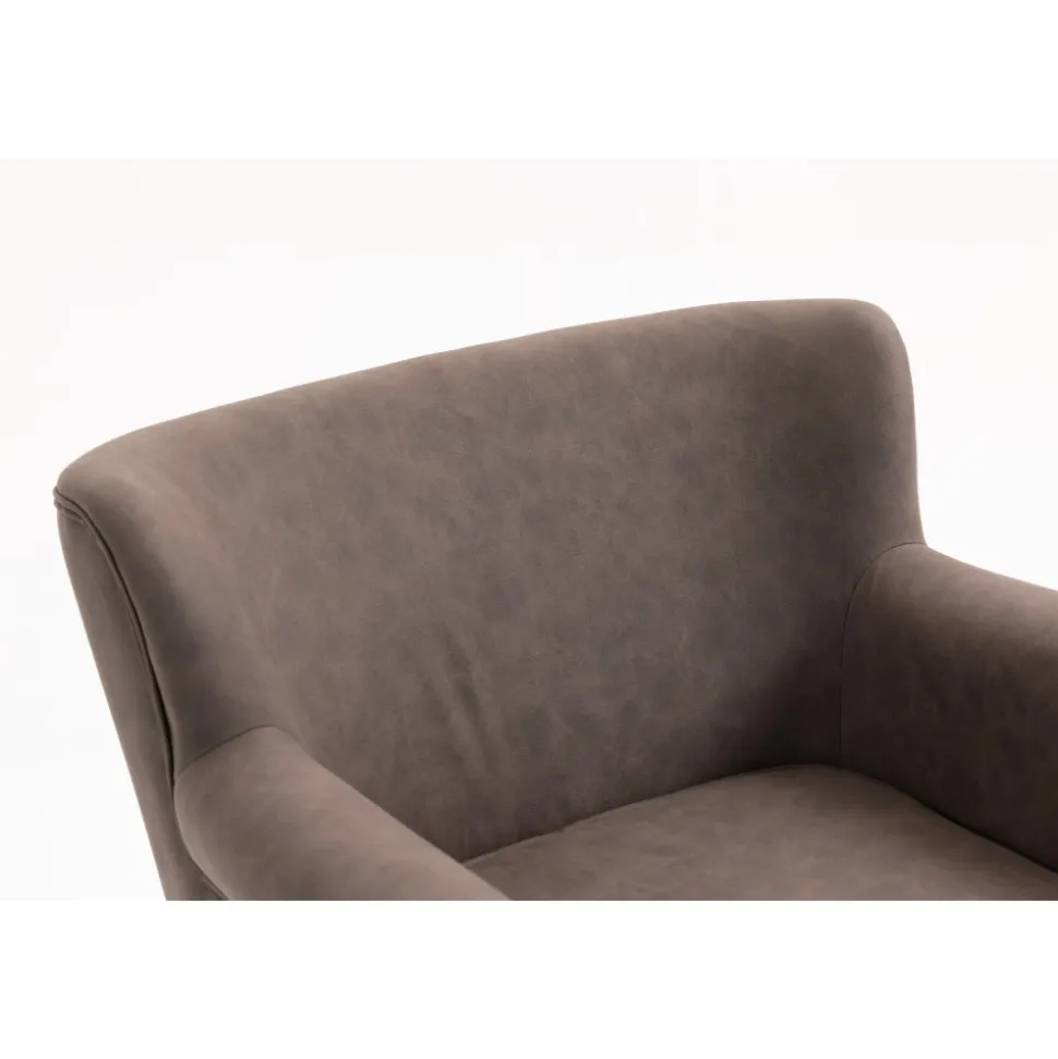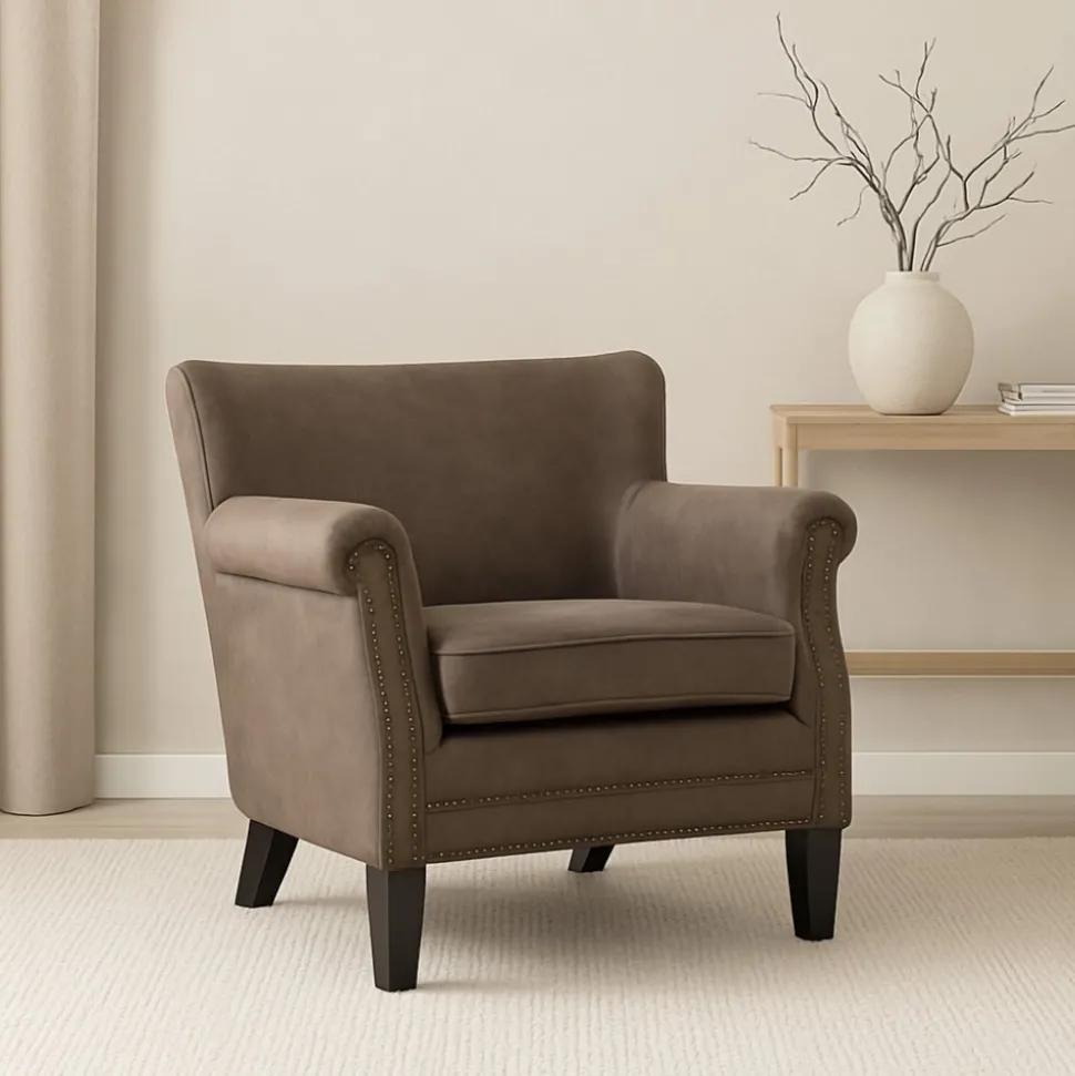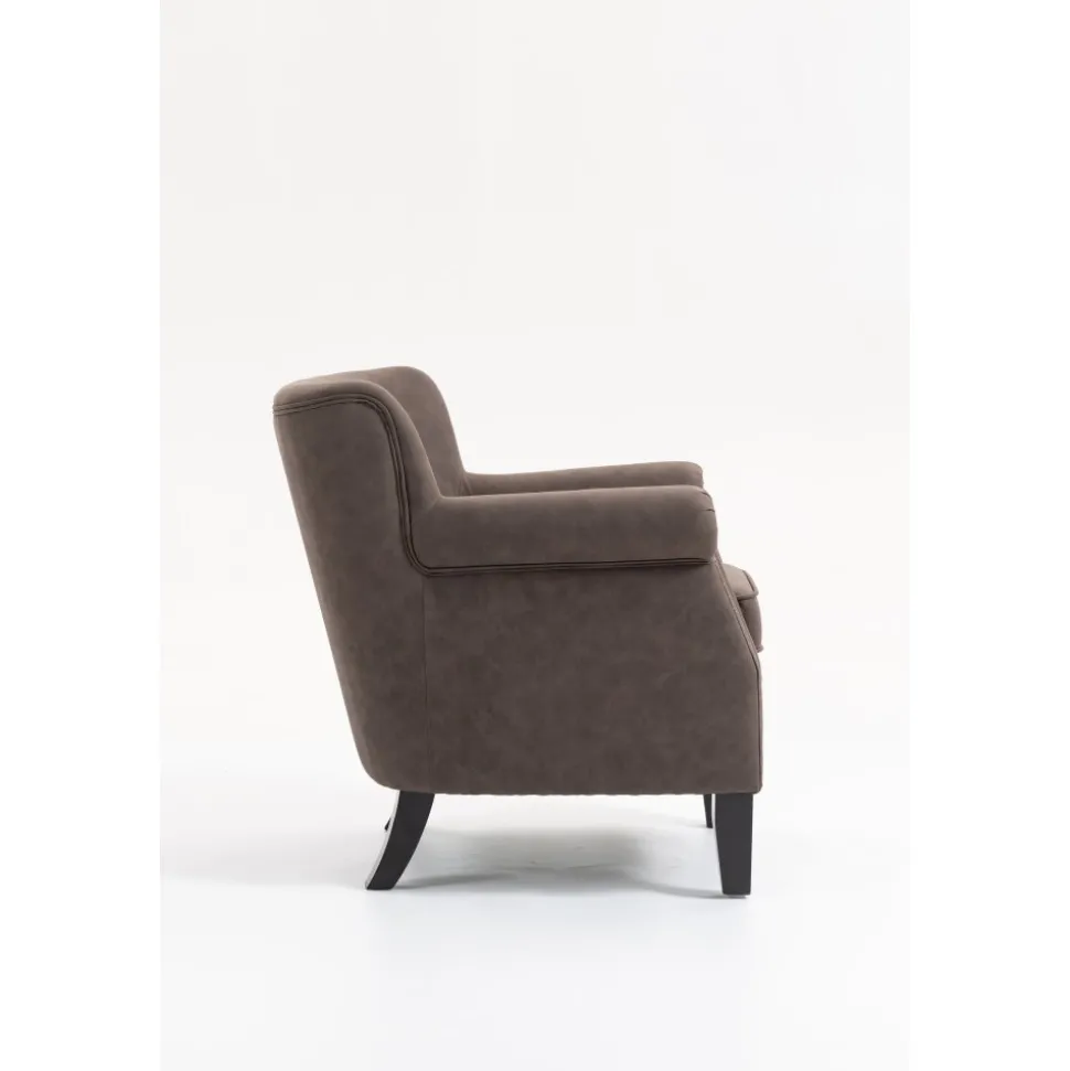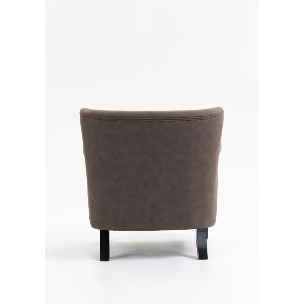 Elegant professorfåtölj klädd i mörkbrunt konstläder (PU) med dekorativa nitar på framsidan. Fåtöljen står stadigt på svarta ben och levereras färdigmonterad redo att användas direkt.